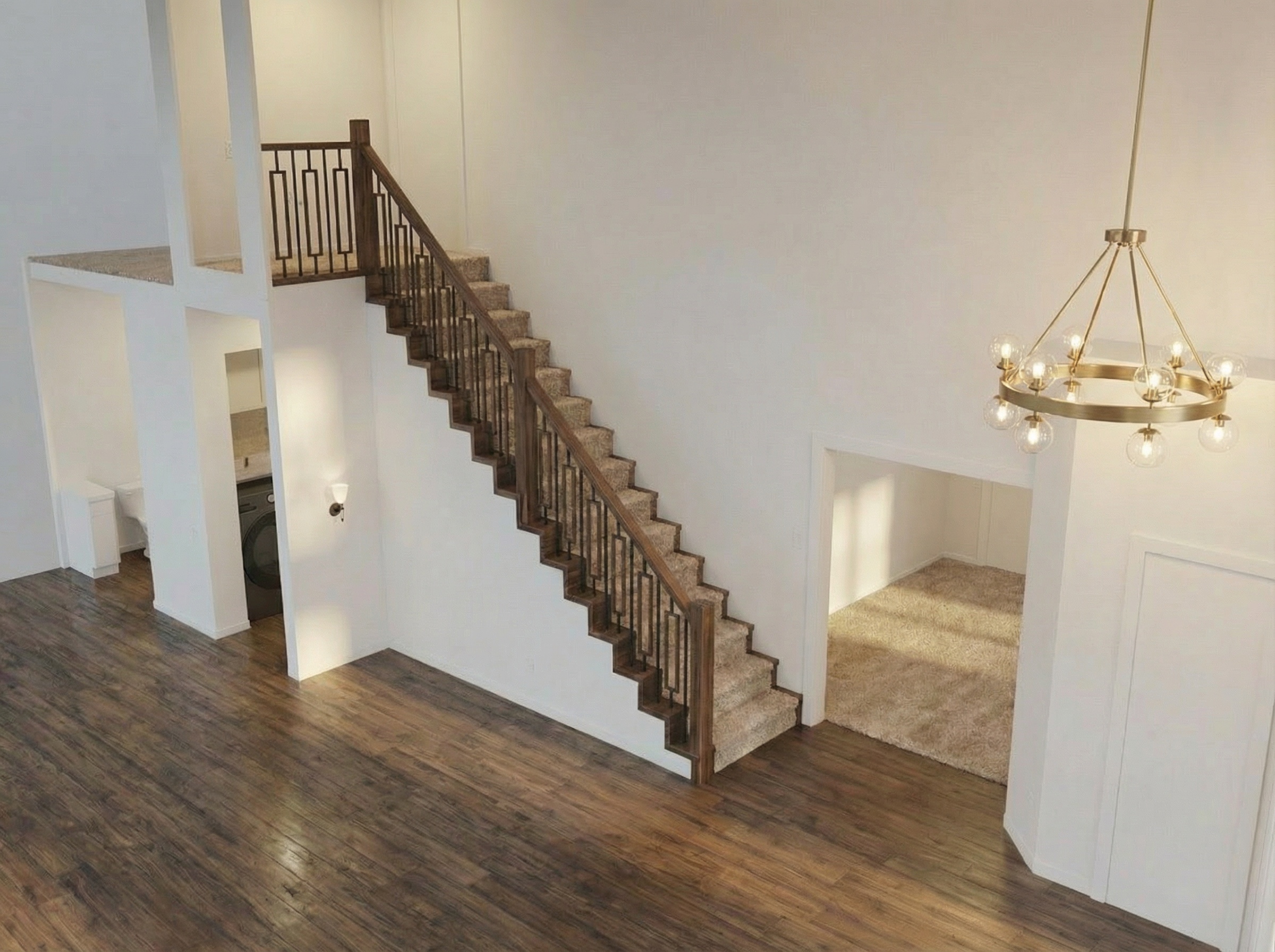 update the runner carpet on the stairs to be a light warm gray with a subtle plaid texture update carpet in bedroom to be the same light warm gray but no texture