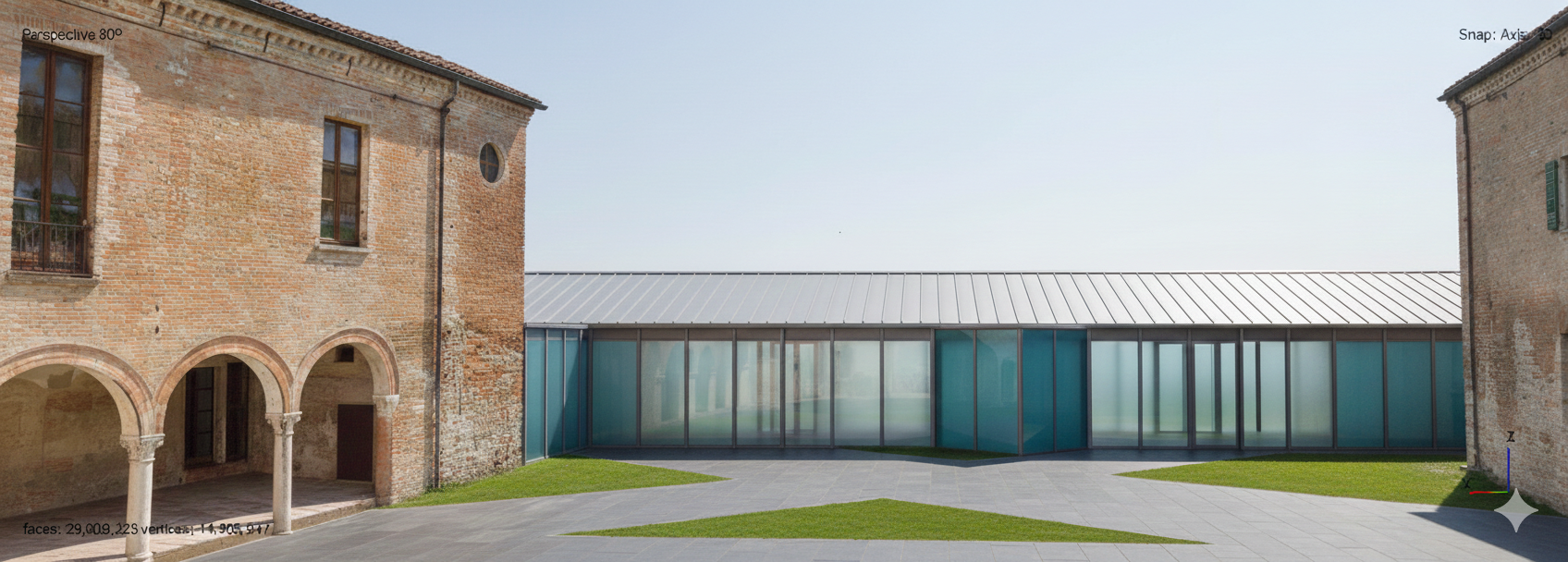 photorealistic architectural visualization lower ceiling height for a more realistic architectural proportion exterior ground surface made of stabilized gravel with natural texture glass panels and doors made of very clear highly transparent glass allowing a clear view of the surrounding countryside with green landscape and trees visible beyond soft natural daylight realistic global illumination high quality materials realistic reflections professional architectural render