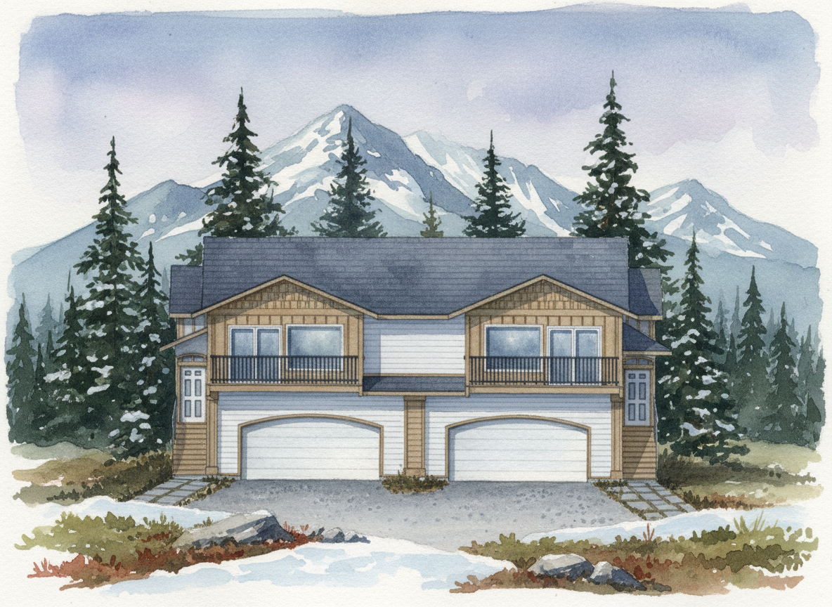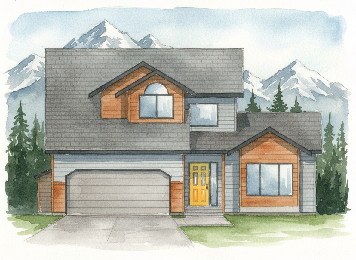 watercolor render of modern home painted blue include trees and an alaska like environment in the background simple driveway and walkways in front of the home