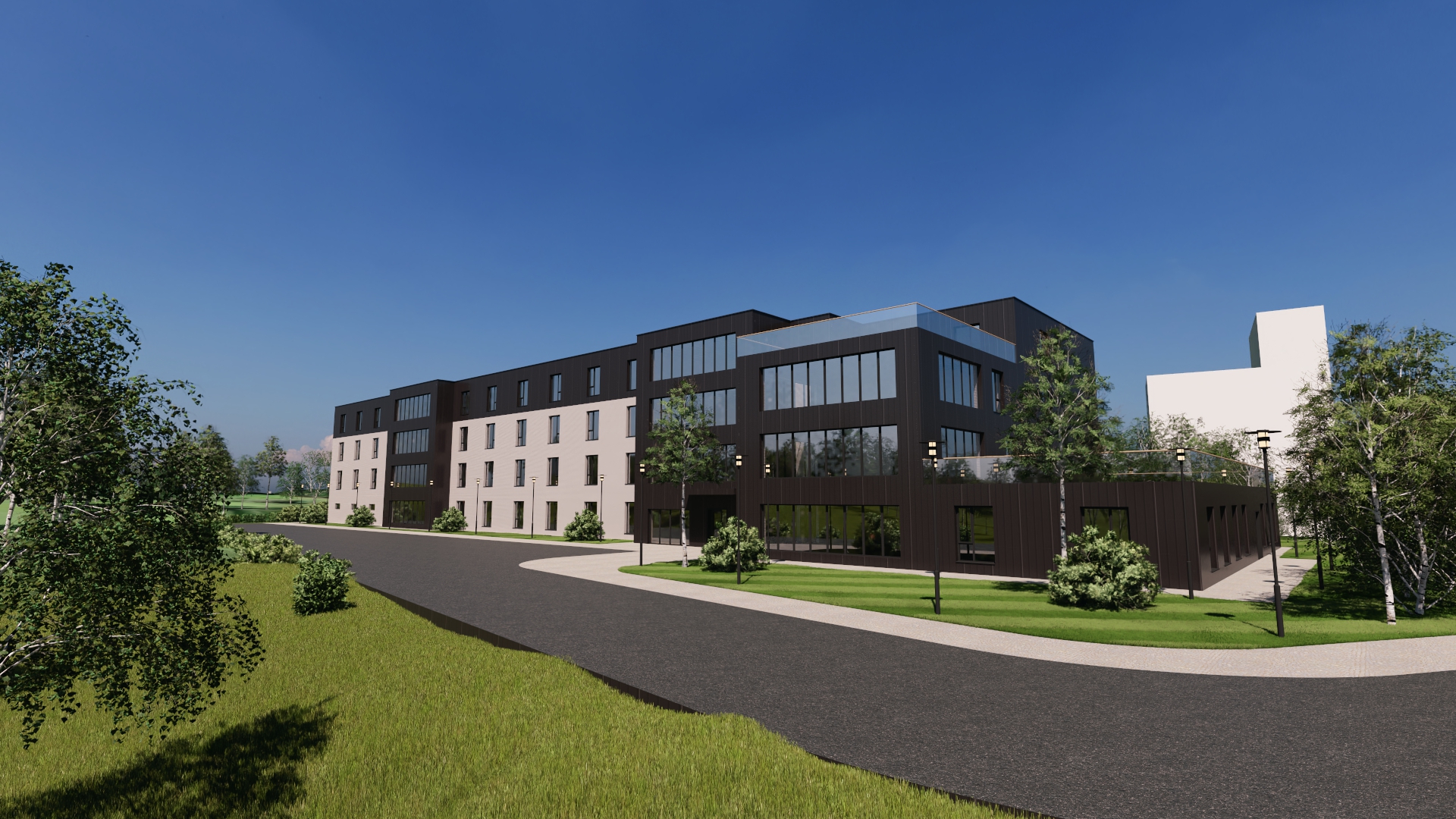 change black rheinzinc to rheinzinc dark grey add curtains add interiors light interiors light up lamps draw park lines in front of building wet floor summer