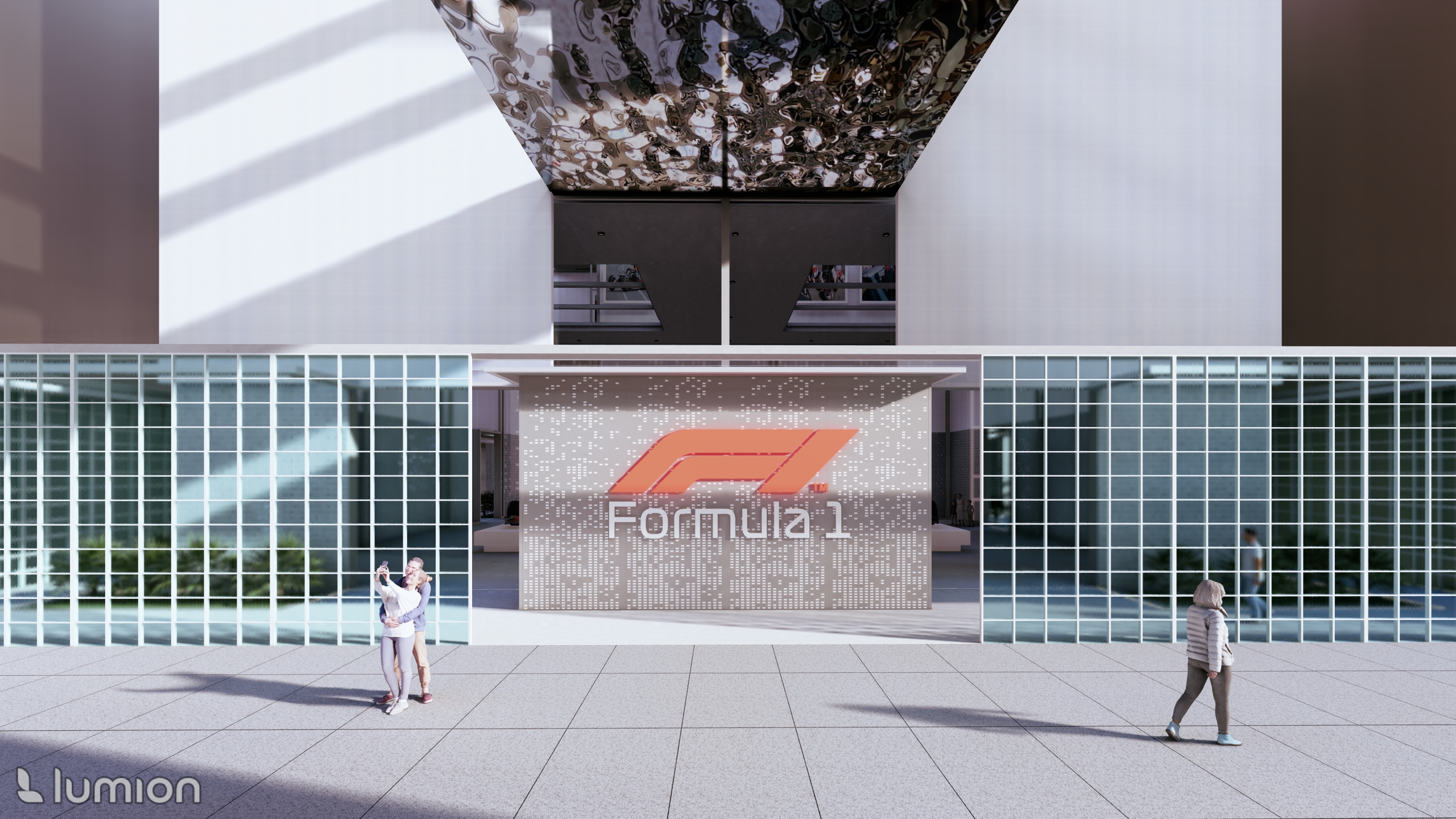 convert this scene into a night render while keeping all architectural elements unchanged add dramatic exterior lighting inspired by motorsport aesthetics glowing red led backlights behind the f1 logo soft white wall washers illuminating the fa ade and subtle floor uplights around the glass blocks the canopy should have recessed linear lighting maintain all existing colours but enhance metallic reflections and shadows realistic sleek and high end f1 atmosphere