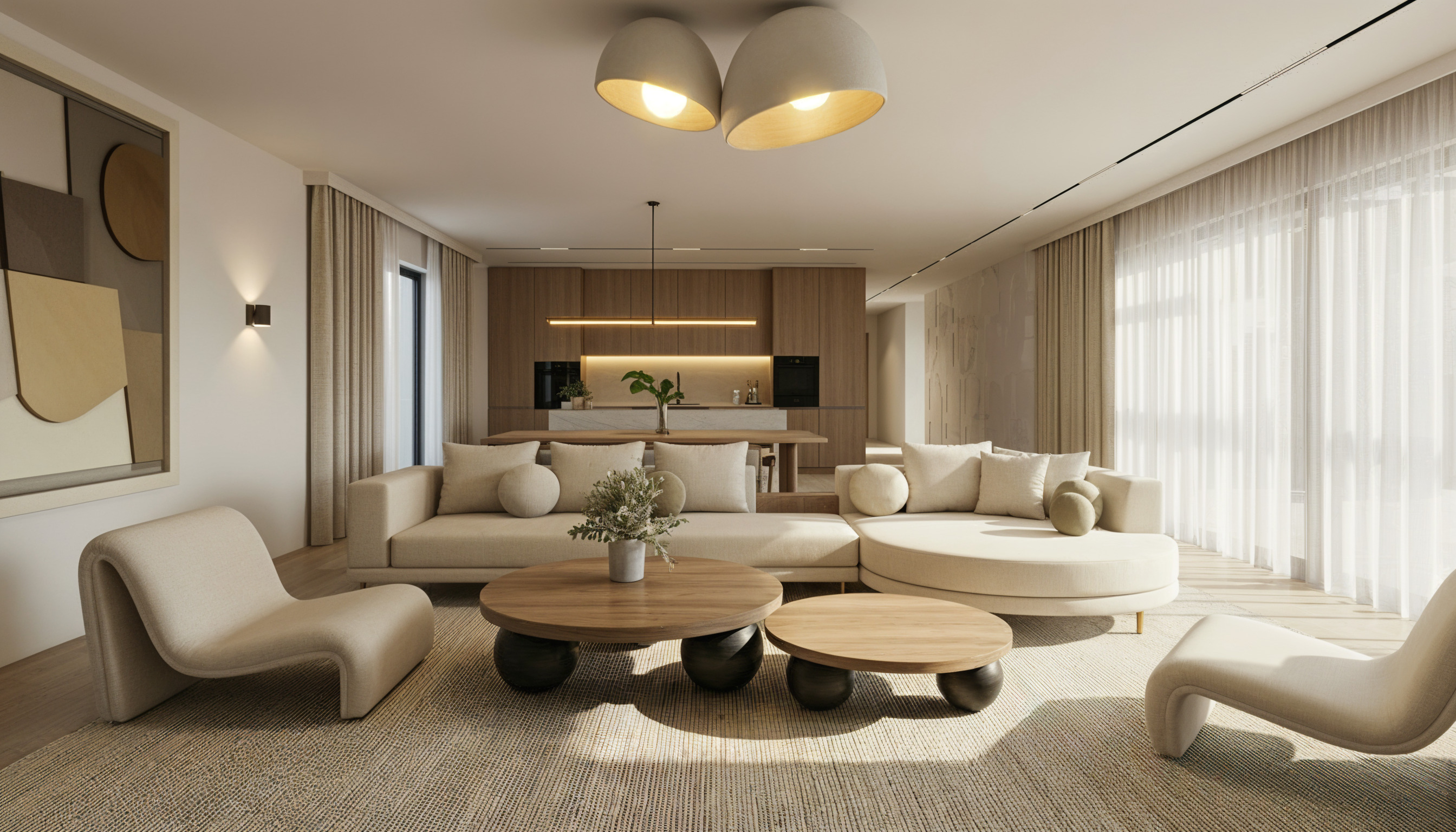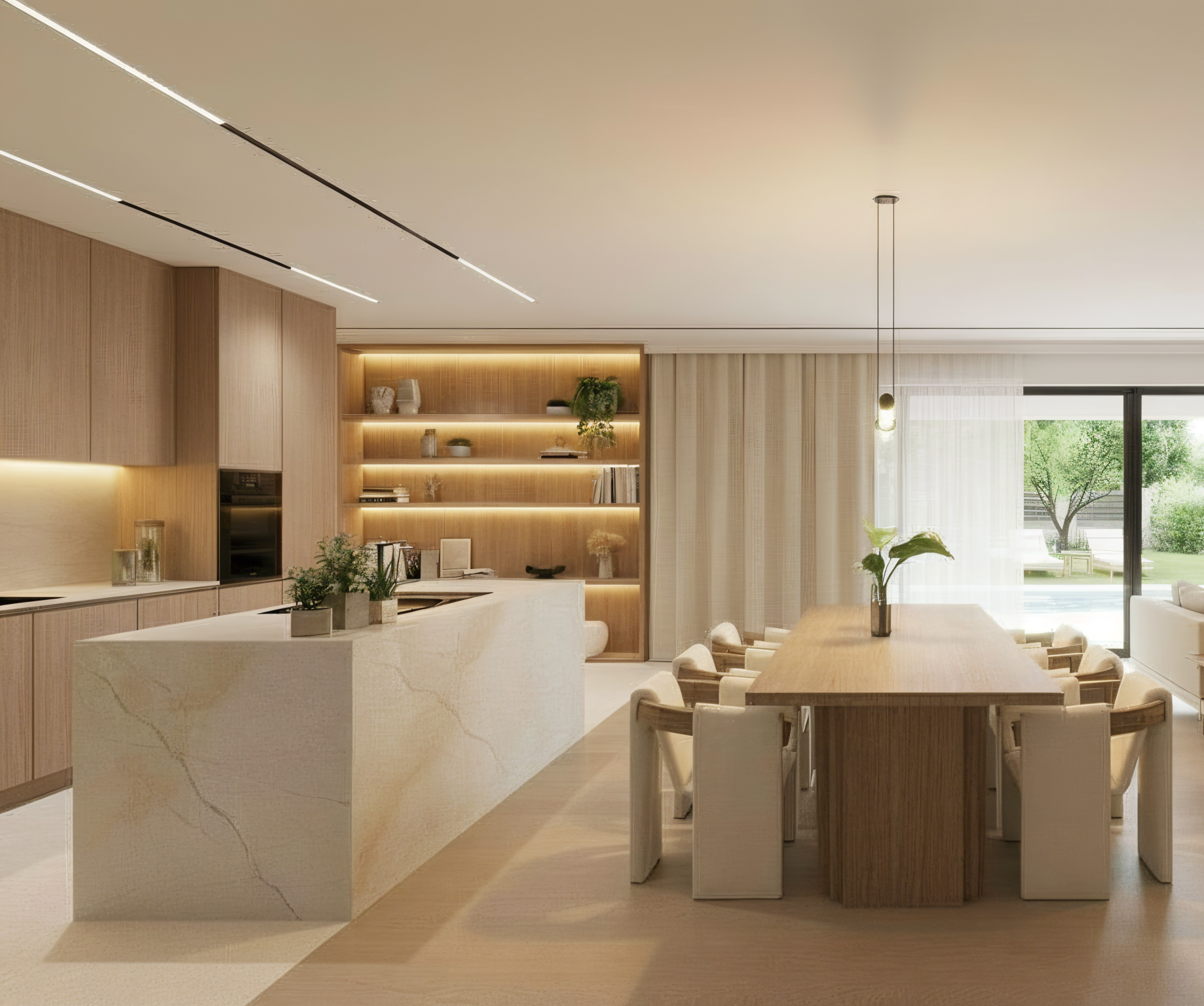 exterior shot add the same shelfs on the picture on the right wall next to the curtains