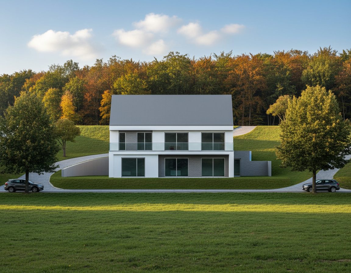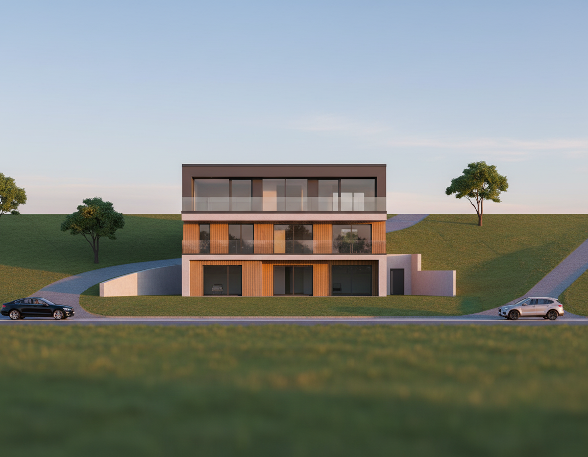 exterior shot sunny day stucco fassade in light ocre color architecture