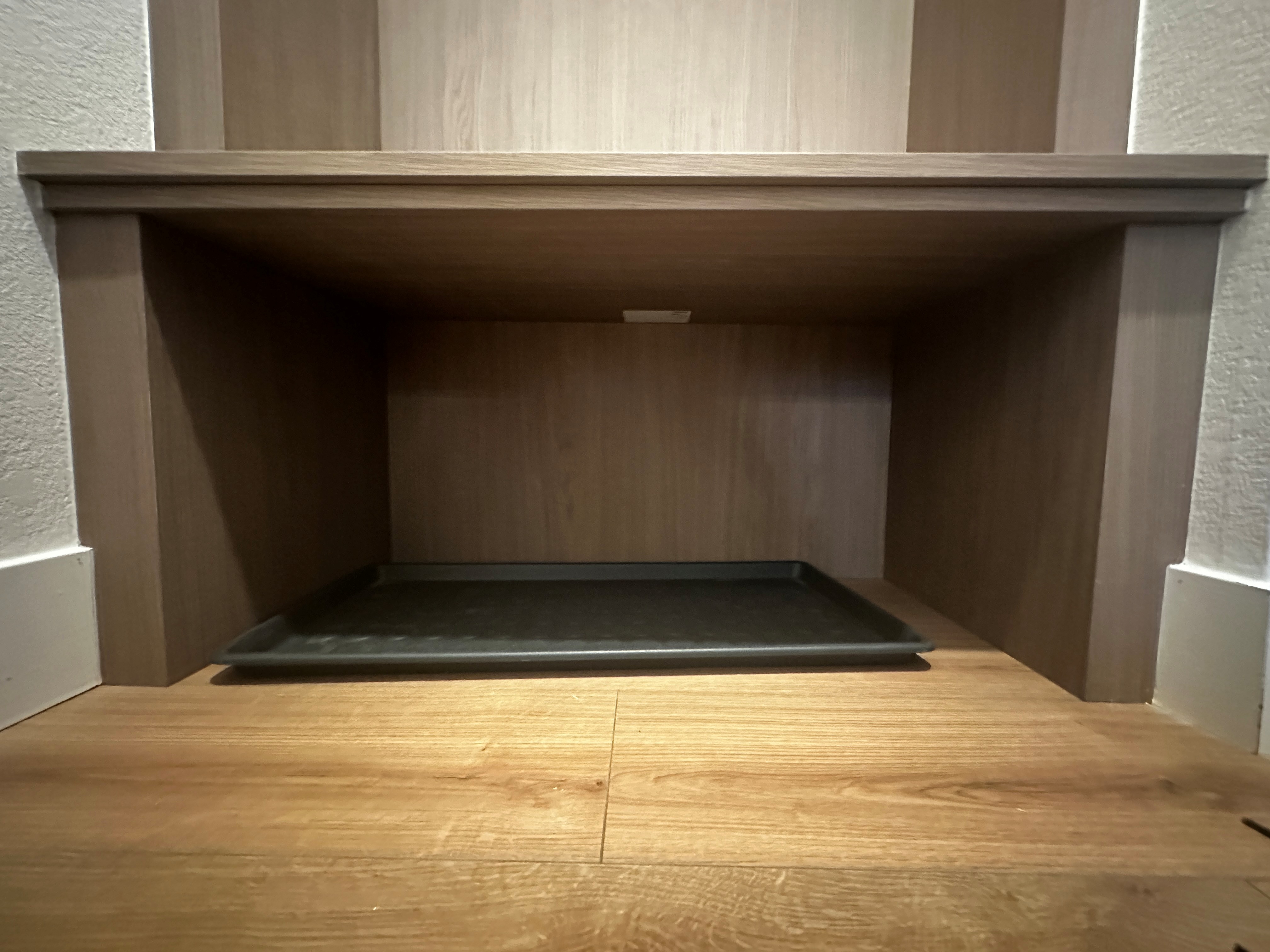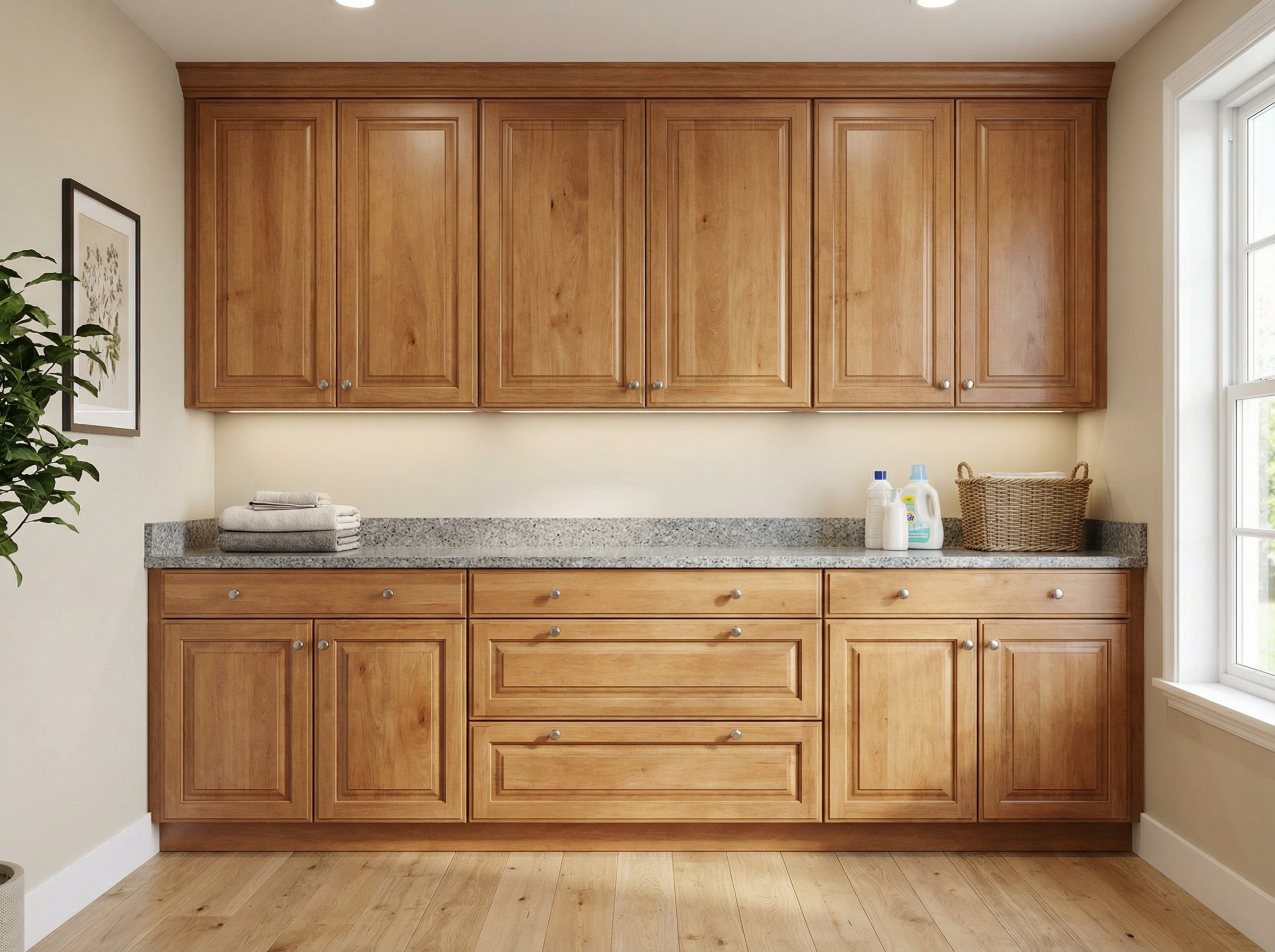 do not change the cabinets in any way preserve the exact cabinet colors materials finishes dimensions door and drawer styles hardware spacing alignment and all geometry exactly as shown do not alter the countertop shape backsplash appliances flooring lighting fixtures or wall structure only remove the construction materials clutter and mess from the scene clean the room and make it look finished and staged add a few simple tasteful home accessories appropriate for the style of the space but do not add or remove any furniture windows or architectural elements maintain the original lighting direction and realism enhance clarity and polish the photo while keeping the cabinetry and room design completely unchanged do not alter the lighting to keep the cabinet colors as they are in the image remove the tray and the sticker on the bottom of the top restage for a mudroom bench
