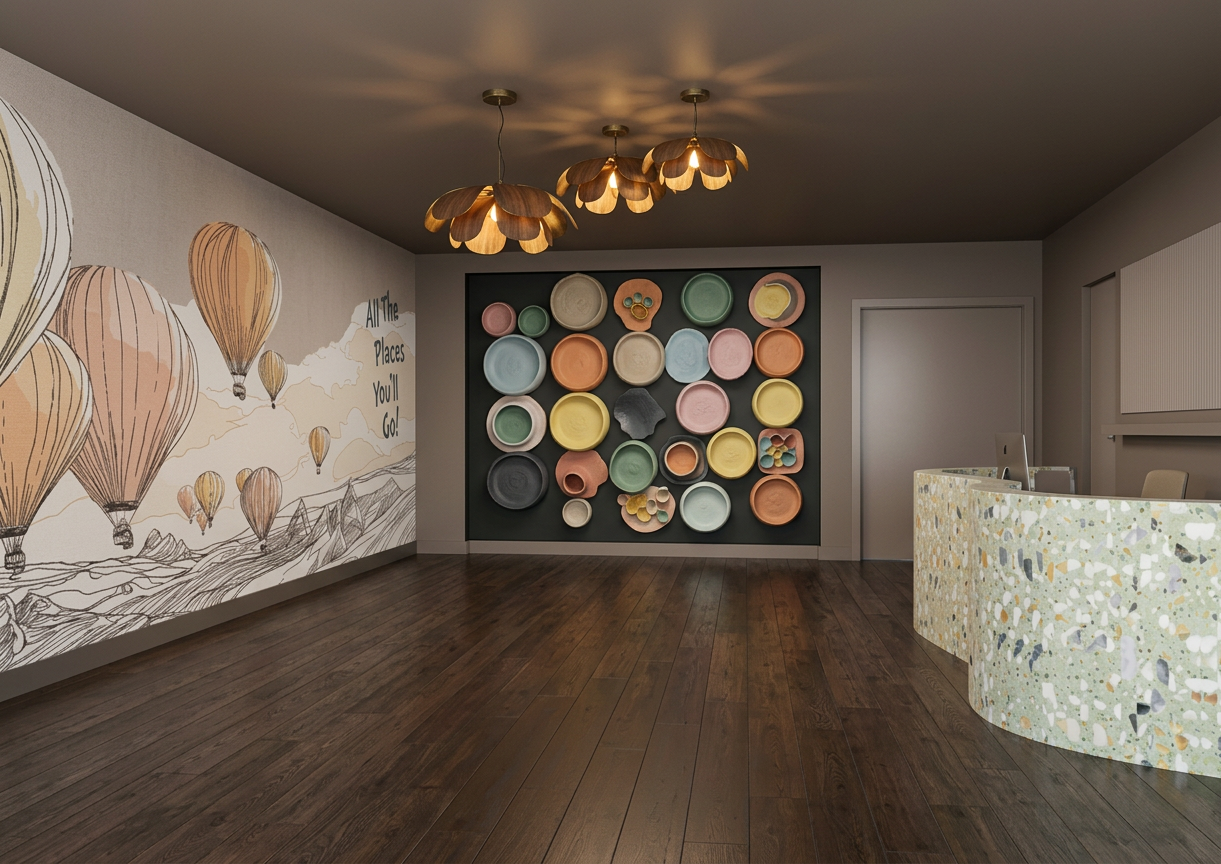 do not change or add retain all model modern dining room minimalist design featuring a round marble table with soft white and gray veining surrounded by elegant off white chairs with dark gray legs the back wall showcases a sophisticated open shelf in light beige metal fatina smoky bronze red dark brown to the right a wooden paneled wall in light maple complements the room with a subtle abstract painting framed in black warm natural light filters through large windows casting soft shadows for a serene and inviting atmosphere