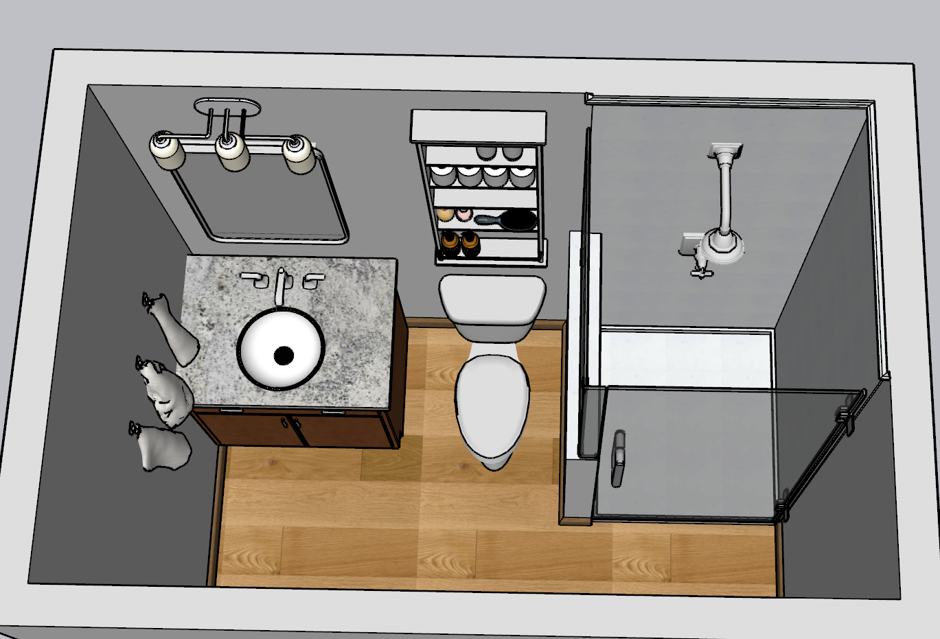 the walls are chantilly lace the shower is a faint marble panel add brightness from overhead lighting not natural light make the sink square undermount put the toilet paper on the wall to the right add a 4 matching backsplash on the back and side of vanity