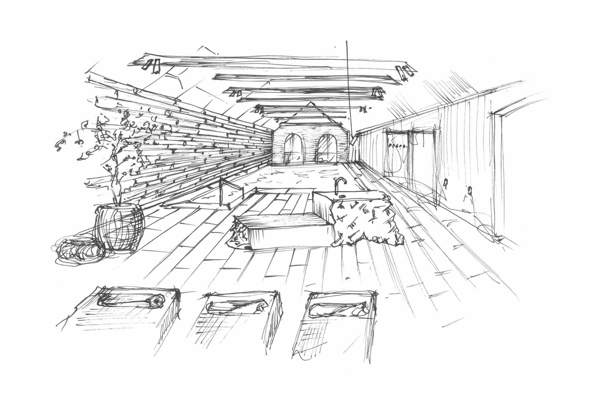 exterior shot high end hotel spa in dark grey schist stone clean minimal architecture with straight lines precise geometry and perfectly aligned surfaces rectangular pool clad in schist split schist bar with sink and spa elements like salt and towels three soft luxury lounge chairs natural wooden ceiling beams warm lighting from black ceiling spots matte surfaces minimalist styling nordic belgian inspired