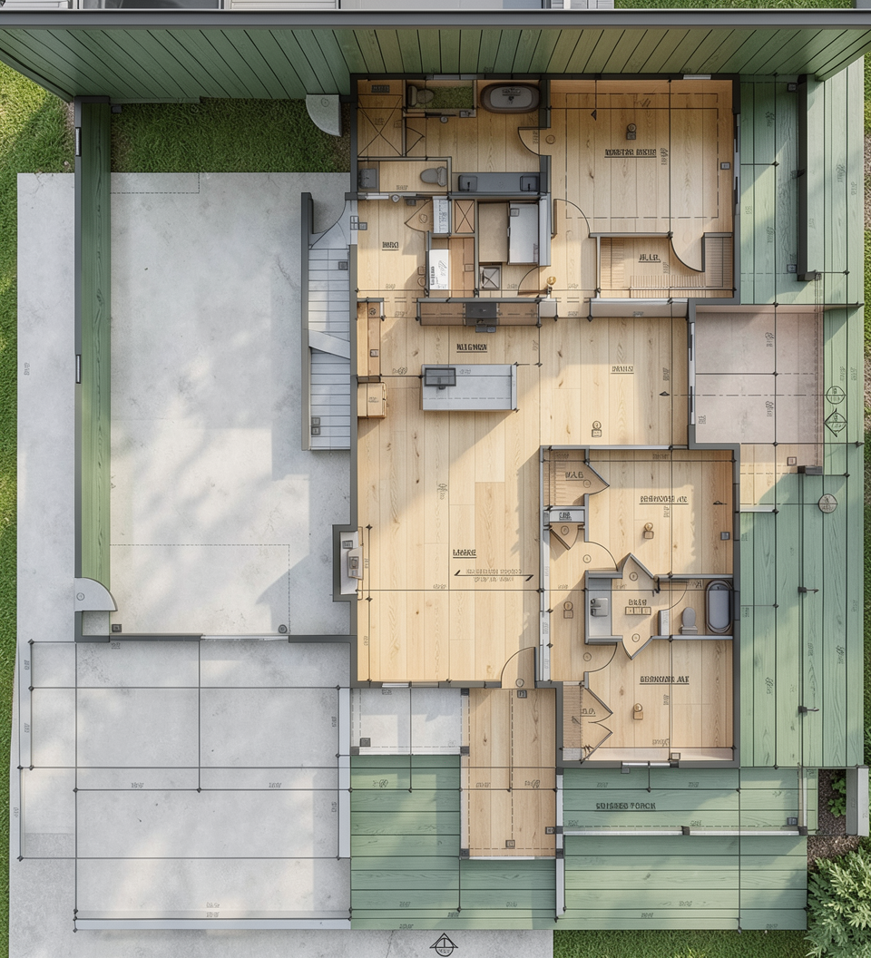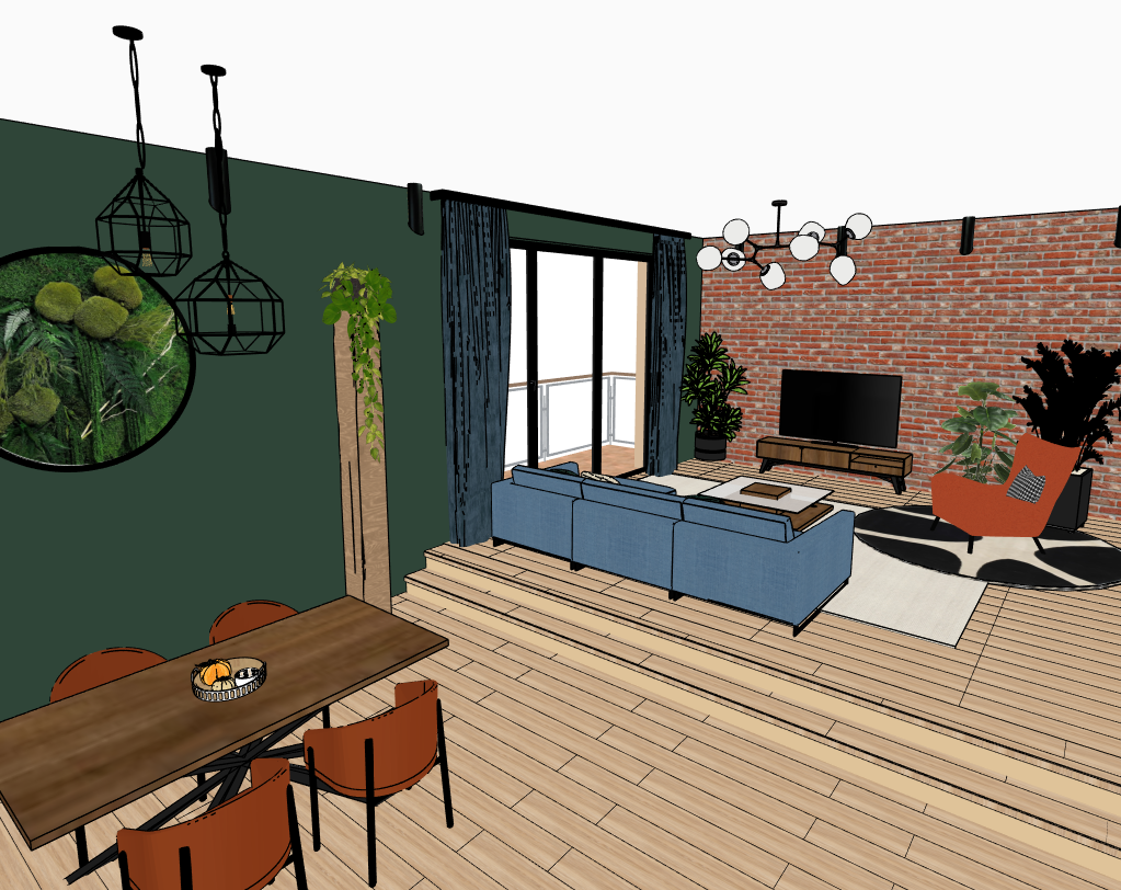 create a soft loft atmosphere the wall is dark green ral6005 the parquet is oak colored striped there is an led strip under the two steps the wall opposite is brick the sofa is blue in front of it is a thin structured beige carpet in front of the sofa is a glass topped coffee table in walnut color the armchair and dining chair are terracotta the armchair is shaped like a curved winged armchair with a black and white cushion on it under the armchair is a black and white round rug the curtains are dark blue a little shiny we can see a big city through the windows the spot lights dimly illuminate the wall the ceiling ball lamps give a pleasant light their lampshades are frosted glass and the frame is black the picture has a soft bright cozy light show everything where it is in the picture