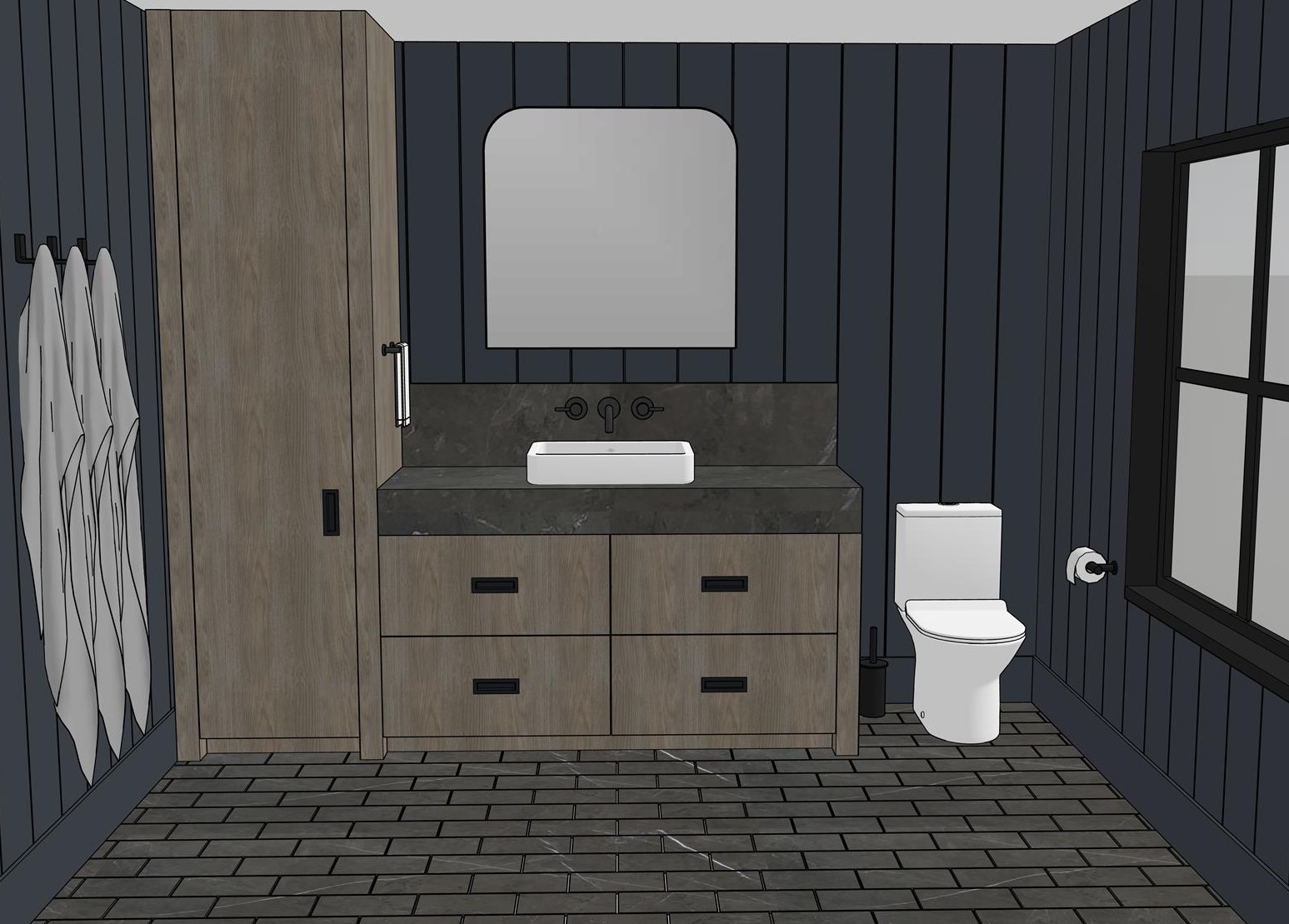 add daytime light for a bright and airy feel moody grey stone floors rustic grey countertop blue baseboard add overhead ceiling lights