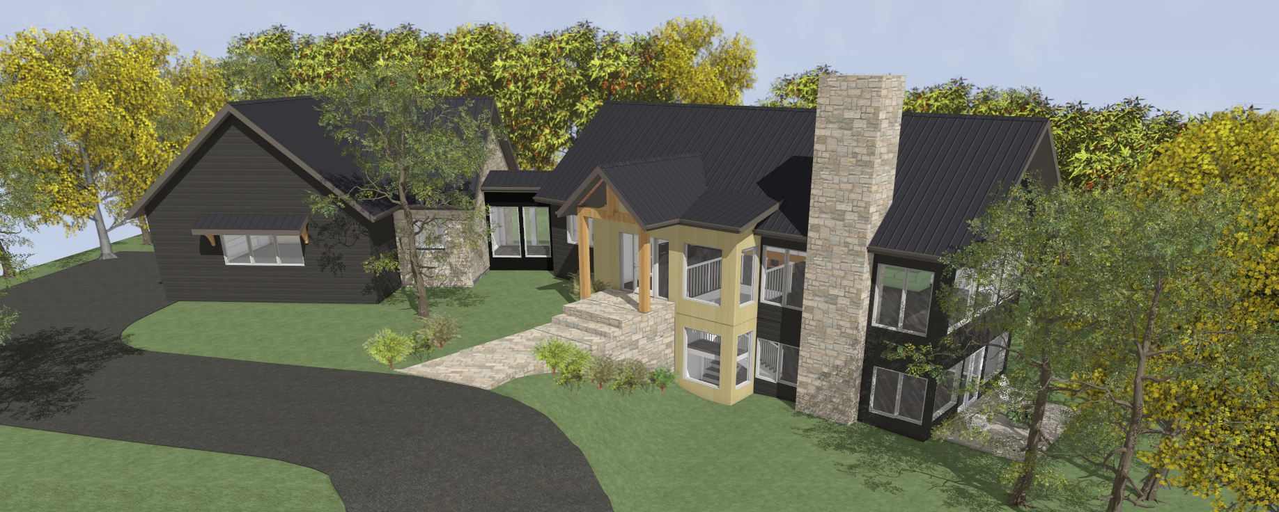 add this home onto a wooded lot surrounded by mature oak trees wisconsin summer golden hour rustic beams light oak siding by front door large trees woods landscaped