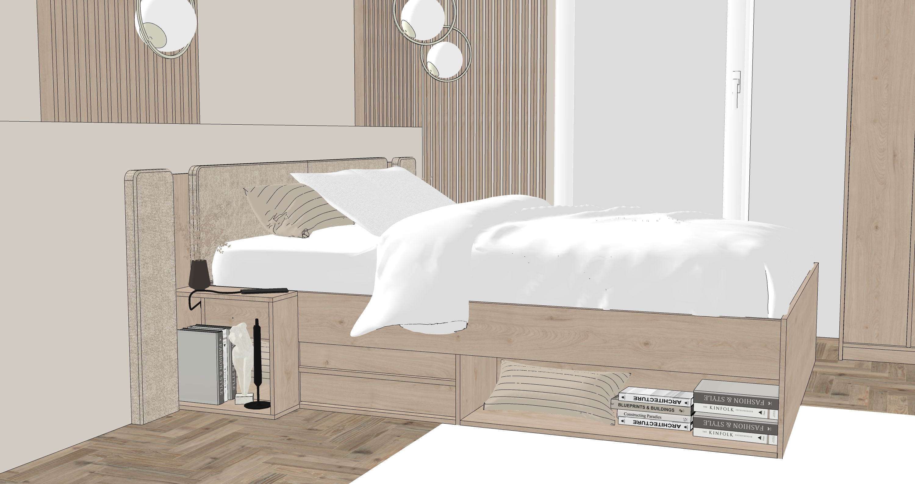 chambre moderne et minimaliste ambiance chaleureuse et naturelle lit double en bois clair avec t te de lit tapiss e en tissu beige linge de lit blanc immacul et soigneusement dispos cadre de lit avec rangements int gr s visibles en bois naturel sol en parquet sombre motif chevrons tapis rectangulaire en fibres naturelles plac sous le lit mur du fond d cor de panneaux verticaux en bois clair tables de chevet int gr es avec vase d coratif et fleurs s ch es suspensions murales design avec globes lumineux dor s diffusant une lumi re chaude grande baie vitr e avec rideaux blancs translucides laissant entrer une lumi re naturelle douce style scandinave japandi palette de couleurs neutres beige bois clair blanc photo ultra r aliste haute r solution rendu architectural clairage naturel atmosph re calme et l gante lampe boule alum e en verre teint au dessus du lit