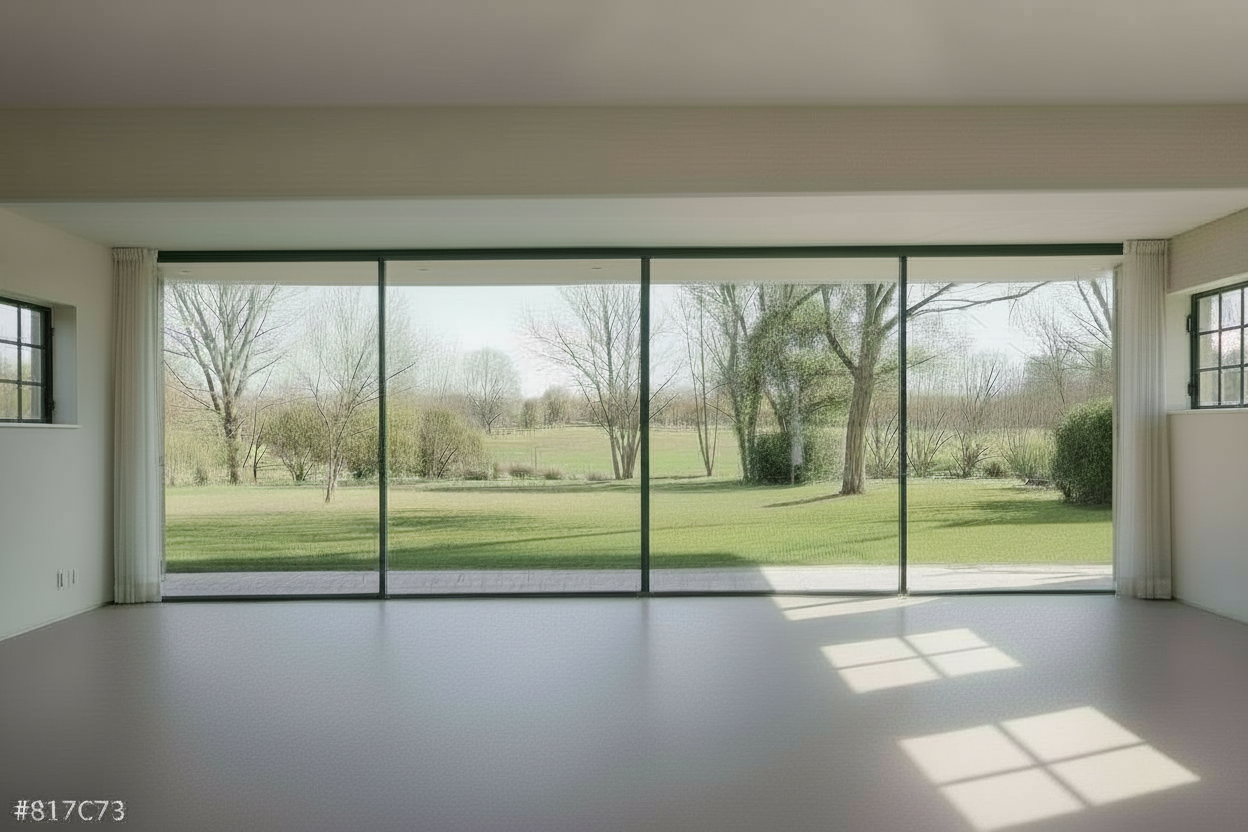 keep everything exactly the same except the two side windows step 1 remove delete all existing mullions inside both side windows each window must become one single clear glass pane no divisions step 2 rebuild now divide each window into exactly 4 equal rectangles by adding 1 vertical line in the exact center 1 horizontal line in the exact center result per window 4 equal panes only 2 columns x 2 rows hard rules no additional lines no extra subdivisions no thin decorative grids no industrial grid pattern no multiple vertical or horizontal bars do not change anything else keep rear sliding glass wall unchanged keep room camera lighting identical