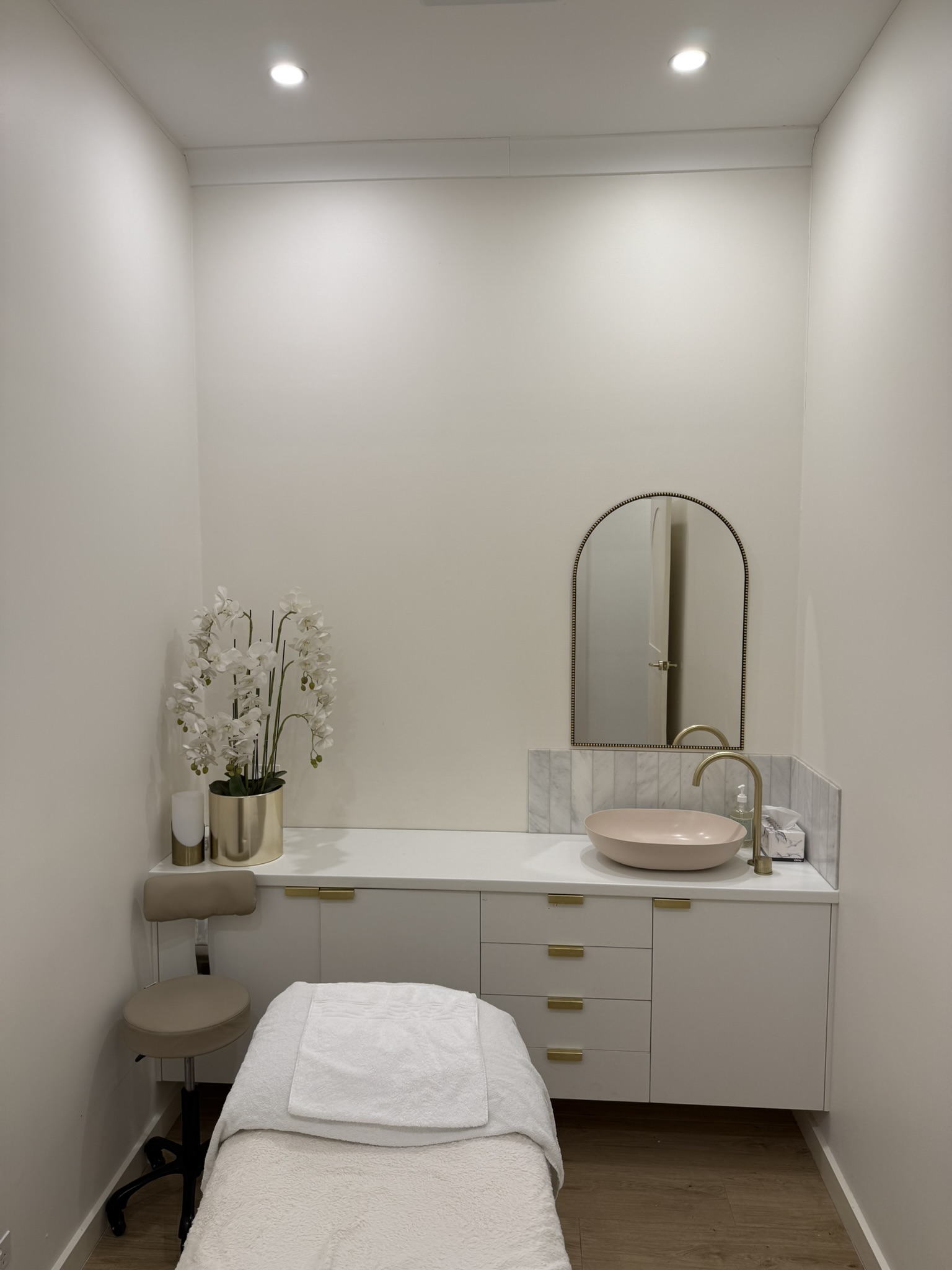 centralise the mirror and do two small natural oak floating shelves either side benchtop to be white and grey marble cupboards to be natural oak woodgrain with no handles