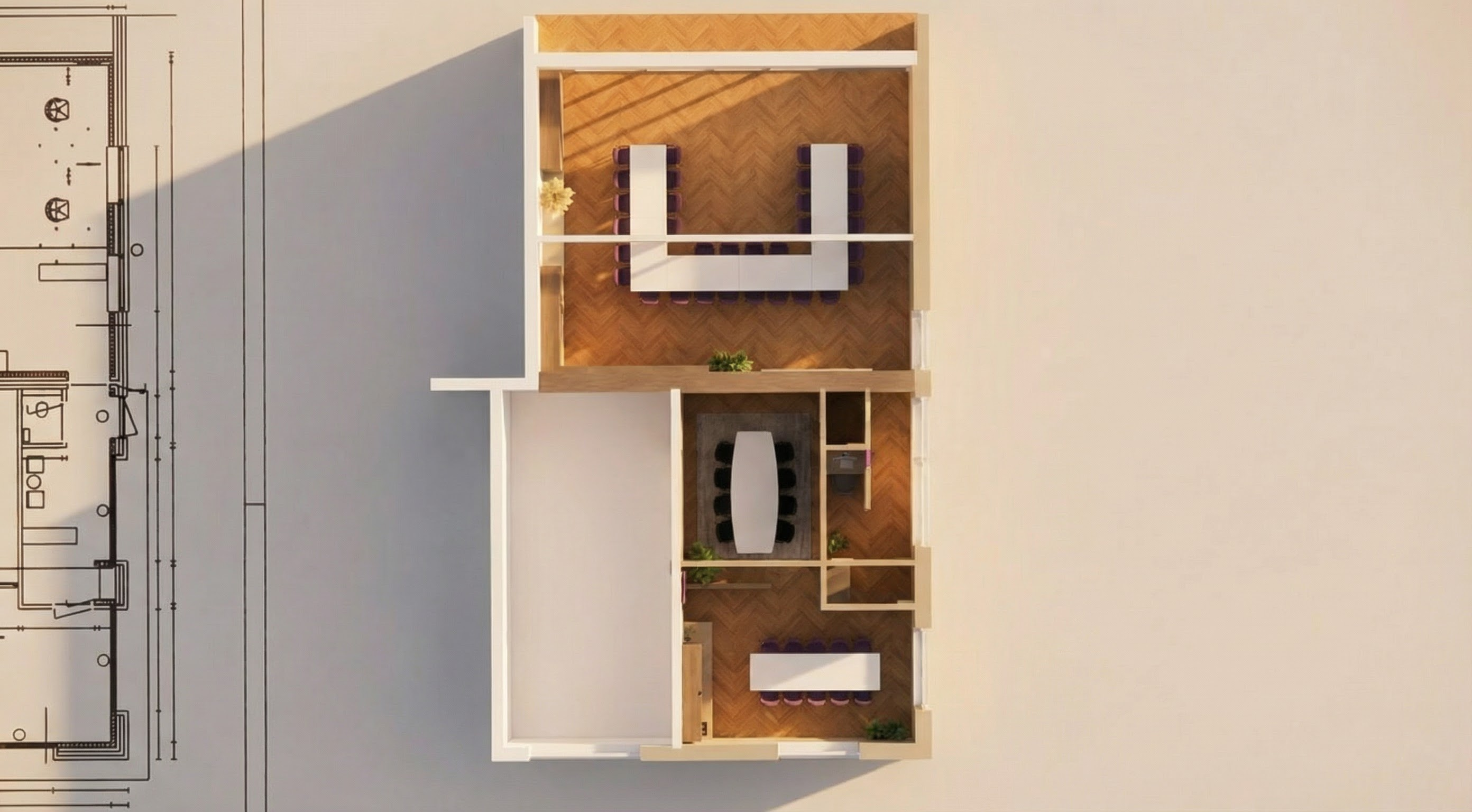 use this image as the base modify only the pavilion umbrella bar scale reduce the pavilion diameter by one third final size about two thirds of the current diameter keep the same proportions shape materials glass walls and dark grey fabric canopy do not change the design only the size position move the pavilion upwards toward the top of the image reposition it so that the upper edge of the pavilion is close to the curved pedestrian walkway without overlapping it the structure must touch or be very close to the inner edge of the walkway but remain entirely on the grass keep clear distance from the wooden deck with sun umbrellas below keep unchanged same orientation no rotation same aerial perspective do not modify grass shape paths deck umbrellas buildings lighting or colors minimal intervention modify only size and position of the pavilion photorealistic aerial rendering