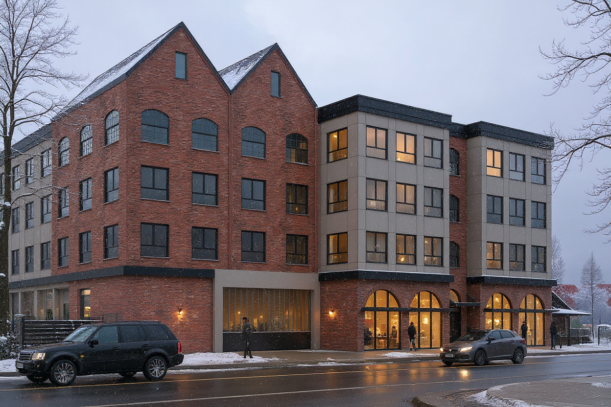 create a beautiful architecture magazine worthy image of this building keep colors textures and existing elements show cars people eating outside and a lively ambiance dusk view
