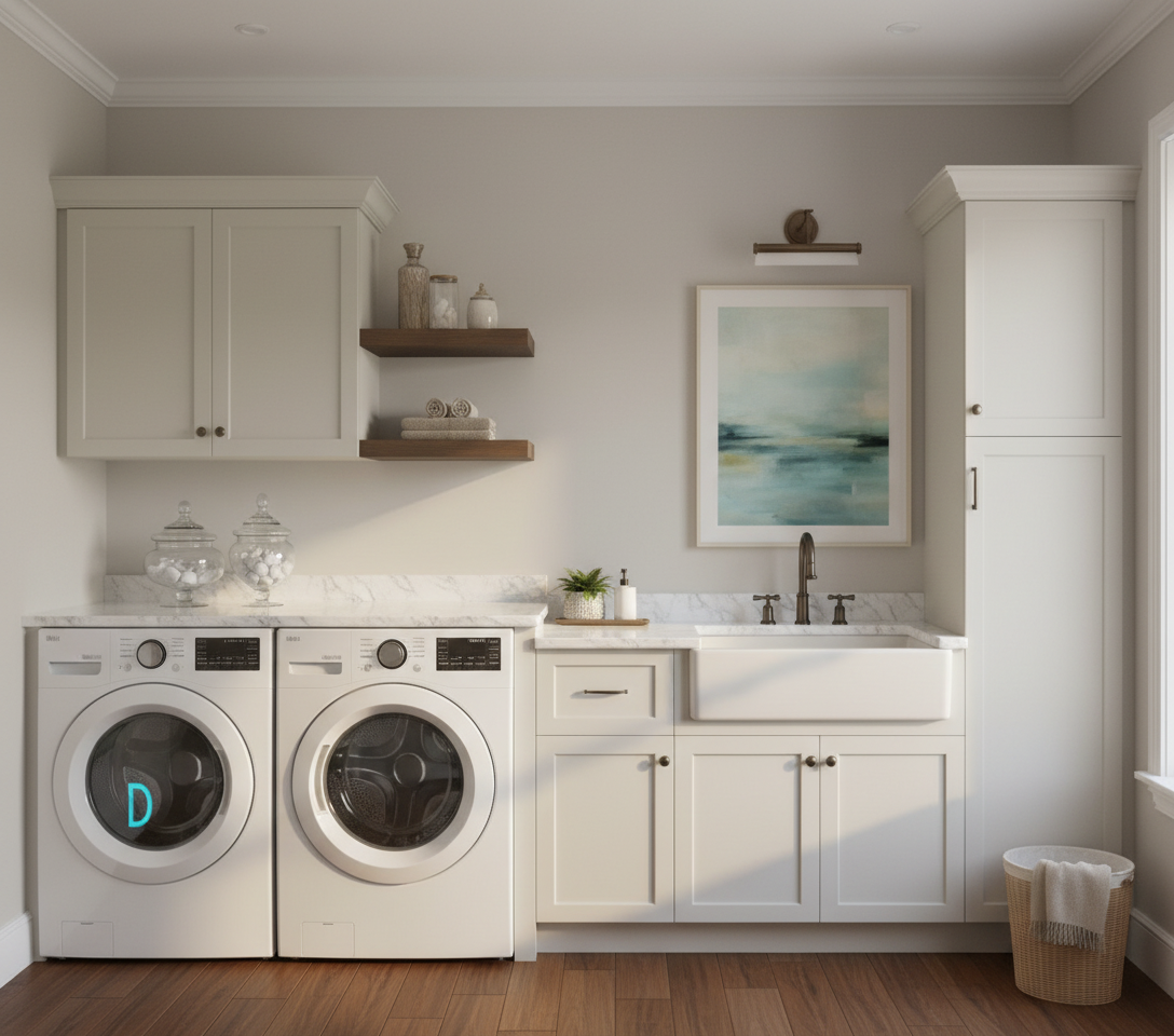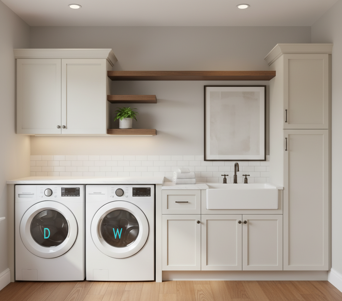 really dark grey almost black painted cabinets brass hardware and faucet dark stained wood open shelving white washer and dryer follow drawing exactly with notations