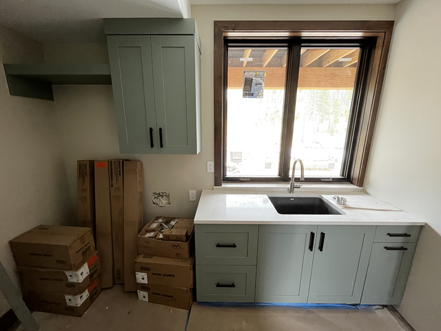 do not change the cabinets in any way preserve the exact cabinet colors materials finishes dimensions door and drawer styles hardware spacing alignment and all geometry exactly as shown do not alter the countertop shape backsplash appliances flooring lighting fixtures or wall structure only remove the construction materials clutter and mess from the scene clean the room and make it look finished and staged add a few simple tasteful home accessories appropriate for the style of the space but do not add or remove any furniture windows or architectural elements maintain the original lighting direction and realism enhance clarity and polish the photo while keeping the cabinetry and room design completely unchanged do not alter the lighting to keep the cabinet colors as they are in the image add a washer and dryer in the opening on the left put a closet rod below the floating shelf with clothes hanging to dry add a simple view out the window change the window trim to be black stage for a laundry room