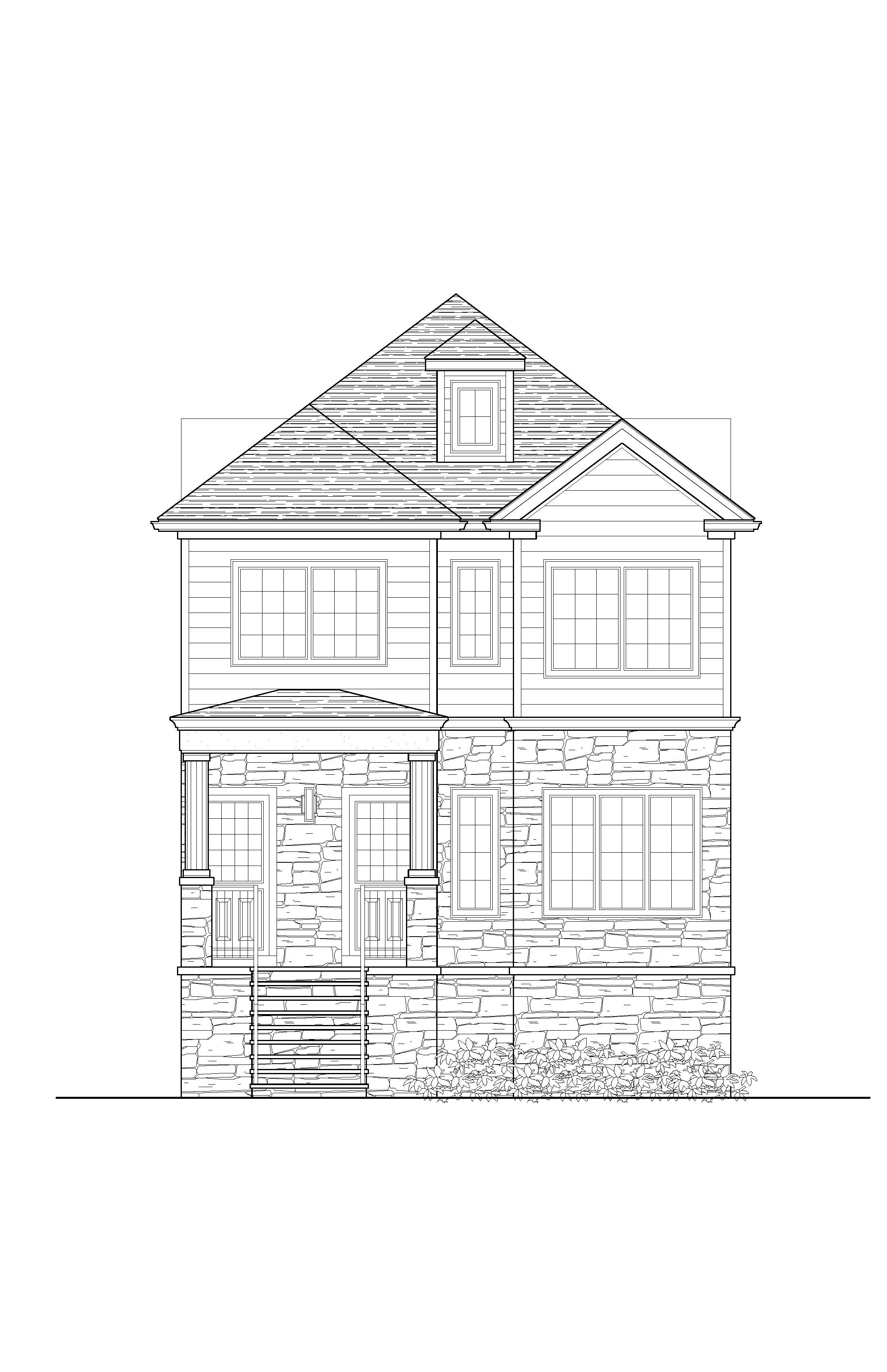 render residential house in a residential nieghborhood with light color siding and stone and black frame windows and doors add some small shrubs at the base of the house there are two front doors make sure the railings are on both sides of the steps going up the lower material should be stone not brick