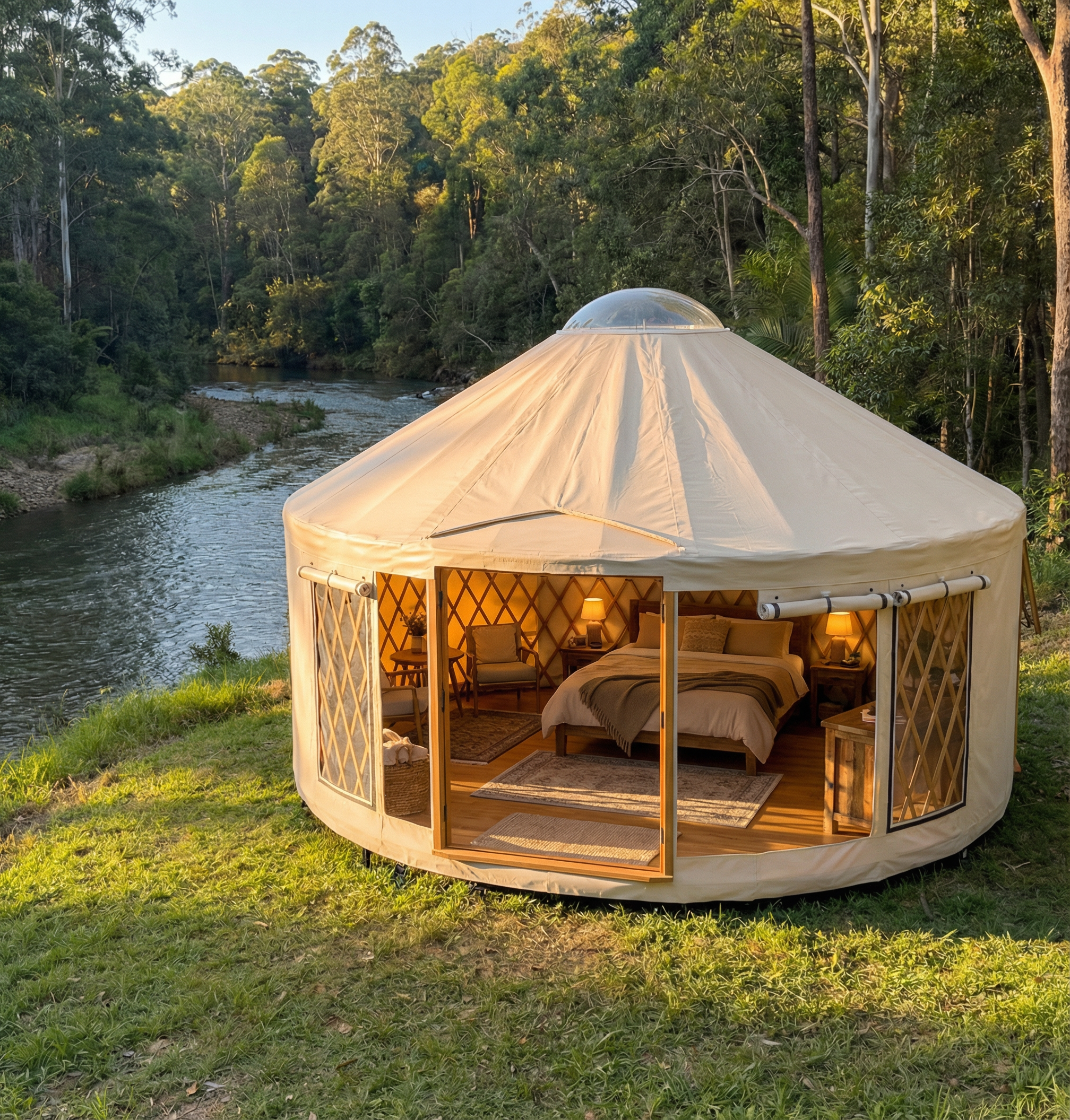 make this yurt bigger in diameter also make the beige outer layer a lighter shade of beige also add cosy internal furnishings that you can see through the windows don t change the windows or doors or remove them