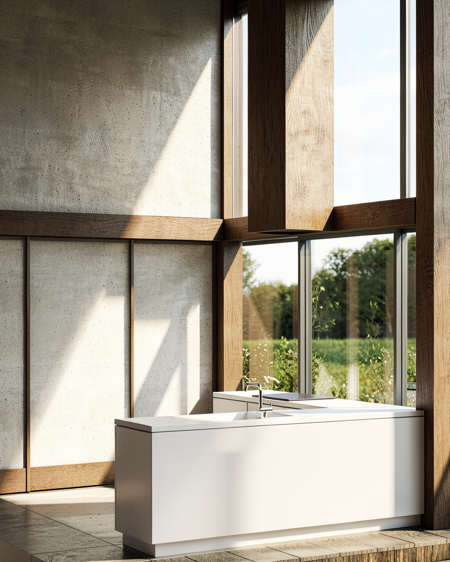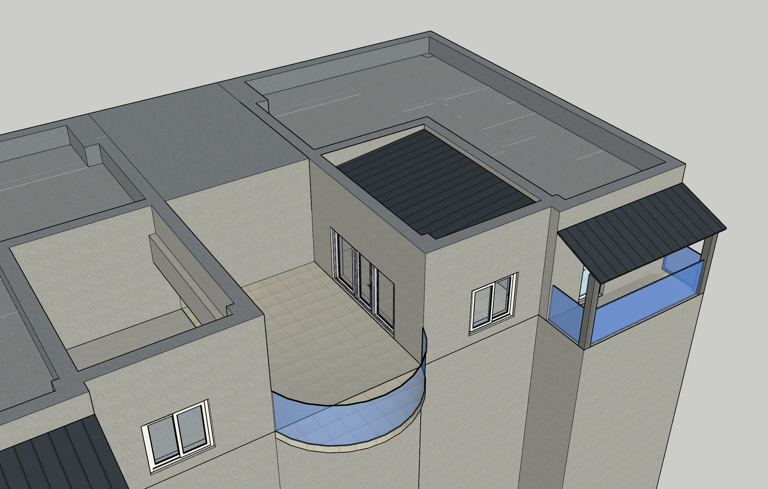 create a photorealistic v ray style daytime exterior render based exactly on the provided 3d model image important geometry rule do not invent extend enlarge or add any terrace balcony slab roof edge parapet floor platform or building volume outside the exact limits shown in the reference drawing the outer limit of the block is exactly the outer limit visible in the model do not add any extra perimeter terrace in front on the right side or anywhere else keep the footprint proportions wall positions terrace edges roof edges and all built elements exactly as in the reference rendering requirements realistic architectural visualization natural daylight soft small shadows clean sky believable materials v ray quality subtle ambient occlusion realistic reflections on glass slightly warm daylight not dramatic not sunset natural exposure not overbright realistic camera perspective similar to the reference view model preservation preserve the exact shape of the apartment preserve the exact terrace dimensions shown in the model preserve the exact covered balcony canopy area on the right side only if it exists in the reference preserve the exact parapet and flat roof geometry preserve window and door positions exactly as shown do not redesign architecture do not change wall thicknesses do not add floors neighboring slab extensions or invented rooftop surfaces materials light beige or off white exterior plaster dark grey flat roof membrane light neutral ceramic tiles on the terrace floor dark anthracite metal canopy realistic blue tinted glass railing subtle concrete texture where visible environment apartment is located on the 4th floor of a 4 storey block show only realistic surrounding urban context in the distance no exaggerated terraces around the apartment no luxury villa look no oversized rooftop platform lighting daytime around late morning or early afternoon soft direct sunlight small realistic shadows natural global illumination output style ultra realistic architectural render high detail clean composition realistic v ray render no fantasy elements no added decorative objects unless minimal and believable negative prompt do not enlarge the terrace do not add extra balcony area do not create slab extensions do not change the building footprint do not invent architecture do not add extra roof platforms do not add pergolas do not add furniture do not add plants do not add people do not make it cinematic or dramatic do not use sunset lighting do not make it look like a penthouse villa