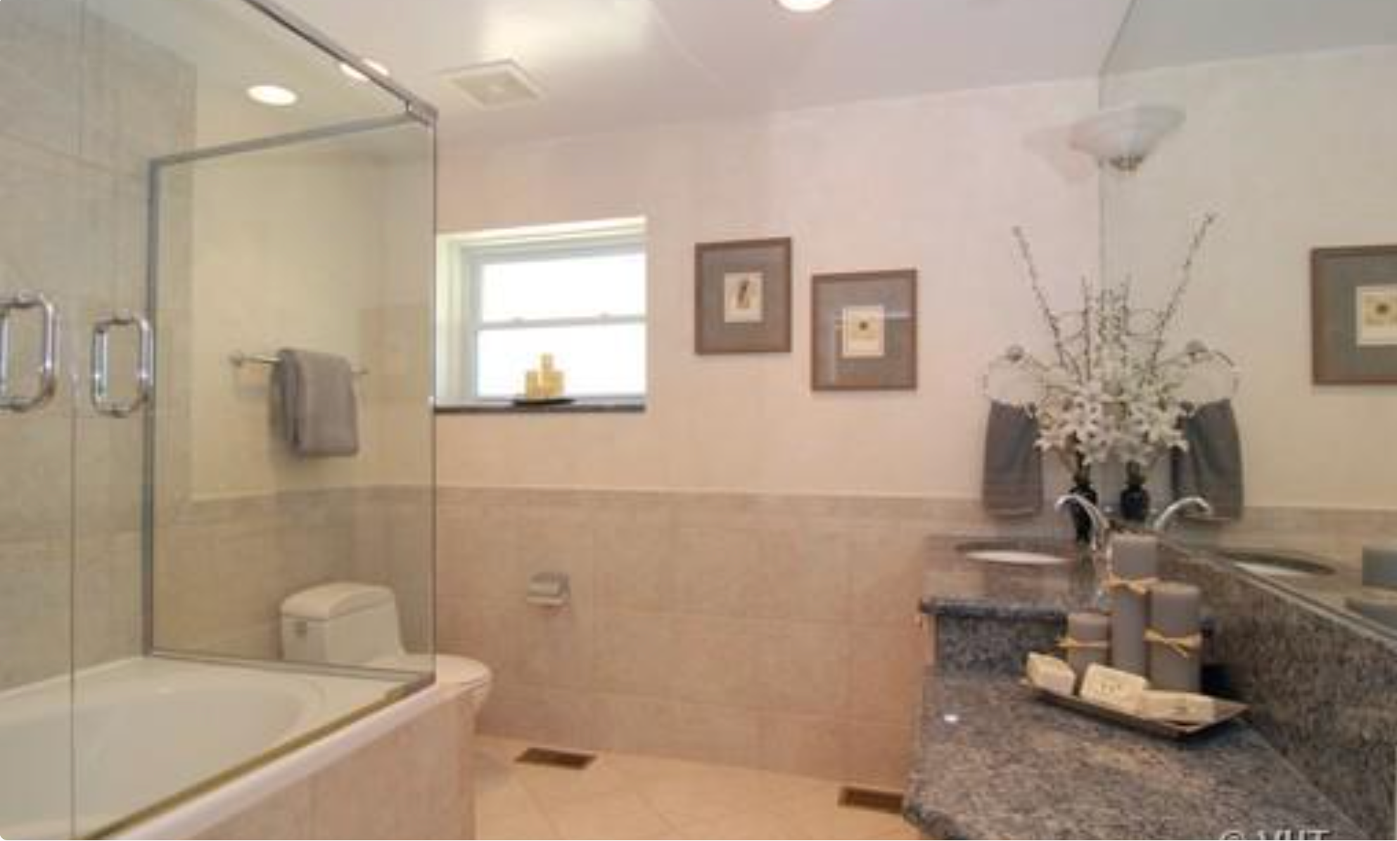 tadao ando wide angle shot full bathroom renovation redesign entire space including shower tub walls and floor do not preserve existing tile tub or shower finishes maintain only layout window and plumbing locations use large format tile on all walls and floors for a seamless modern look light creamy neutral palette with warm tones replace tub surround with clean modern tile and minimal glass panel update shower area completely install new 42 inch single sink vanity with integrated makeup area in a soft neutral or painted finish not all wood light stone countertop add led mirror with wall sconces brushed gold fixtures throughout clean minimal high end residential bathroom no clutter architecture