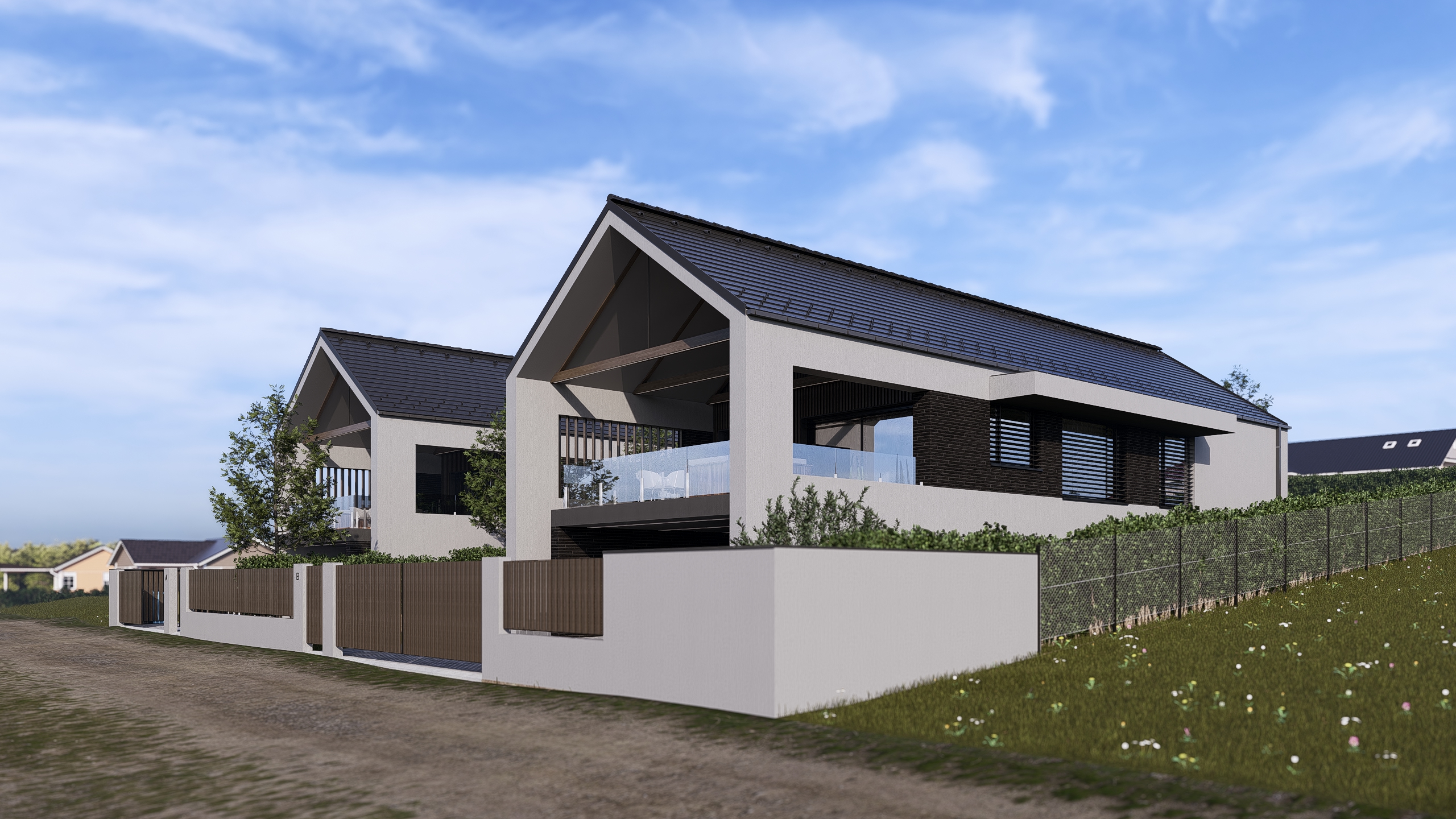 keep the building and the fence as it is keep the buildings in the surroundings keep the terrains shape keep the existing trees and hedges just enhance them enhance the vegetation this is a low sloping hillside with lack of trees vegetation like on a hungarian field with grass and meadow flowers hyper realistic architectural visualization quality 4k resolution 16 9 landscape ratio
