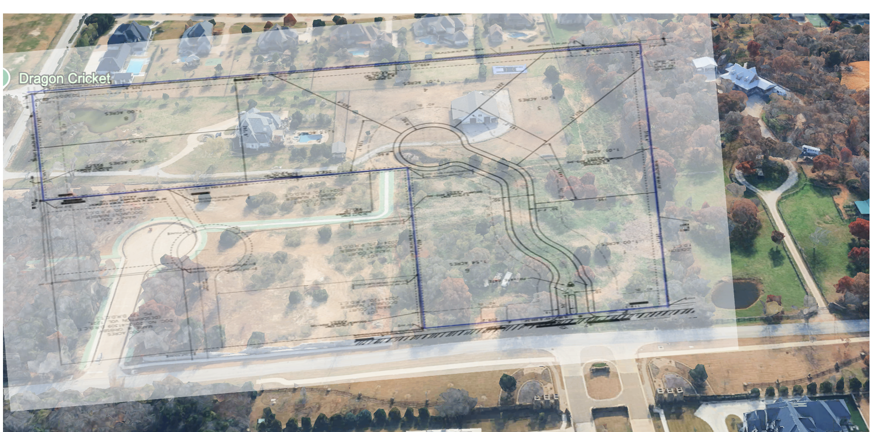 transform this aerial image into a photorealistic luxury residential subdivision remove all existing man made structures including houses barns driveways sheds and any existing improvements replace with clean natural terrain native grass and preserved mature trees maintain the exact subdivision layout shown in the overlay curved private road cul de sac geometry and 8 one acre lot configuration roads should appear newly constructed with clean asphalt and concrete curbs add 8 high end custom estate homes each positioned appropriately within lot boundaries with generous setbacks from the street homes should be large 5 000 8 000 sf modern transitional luxury style common in southlake texas include long private driveways manicured lawns ornamental landscaping and subtle fencing where appropriate preserve existing mature trees throughout the site with selective clearing around homes and roads to maintain a natural estate feel add a premium gated entrance at the main road with stone columns iron gates and a landscaped entry feature maintain natural topography with gentle slopes and drainage areas lighting should be cinematic golden hour with soft shadows camera angle should be slightly angled aerial not top down showcasing depth road curvature and lot layout ultra realistic highly detailed textures 8k quality photorealistic rendering