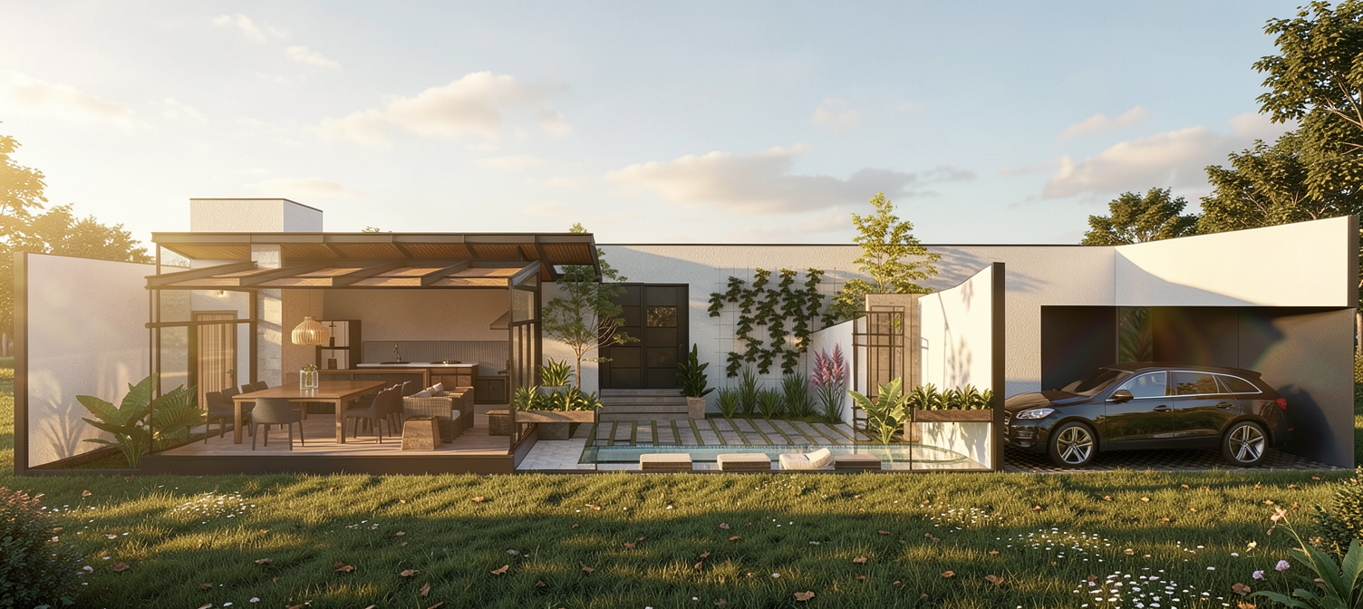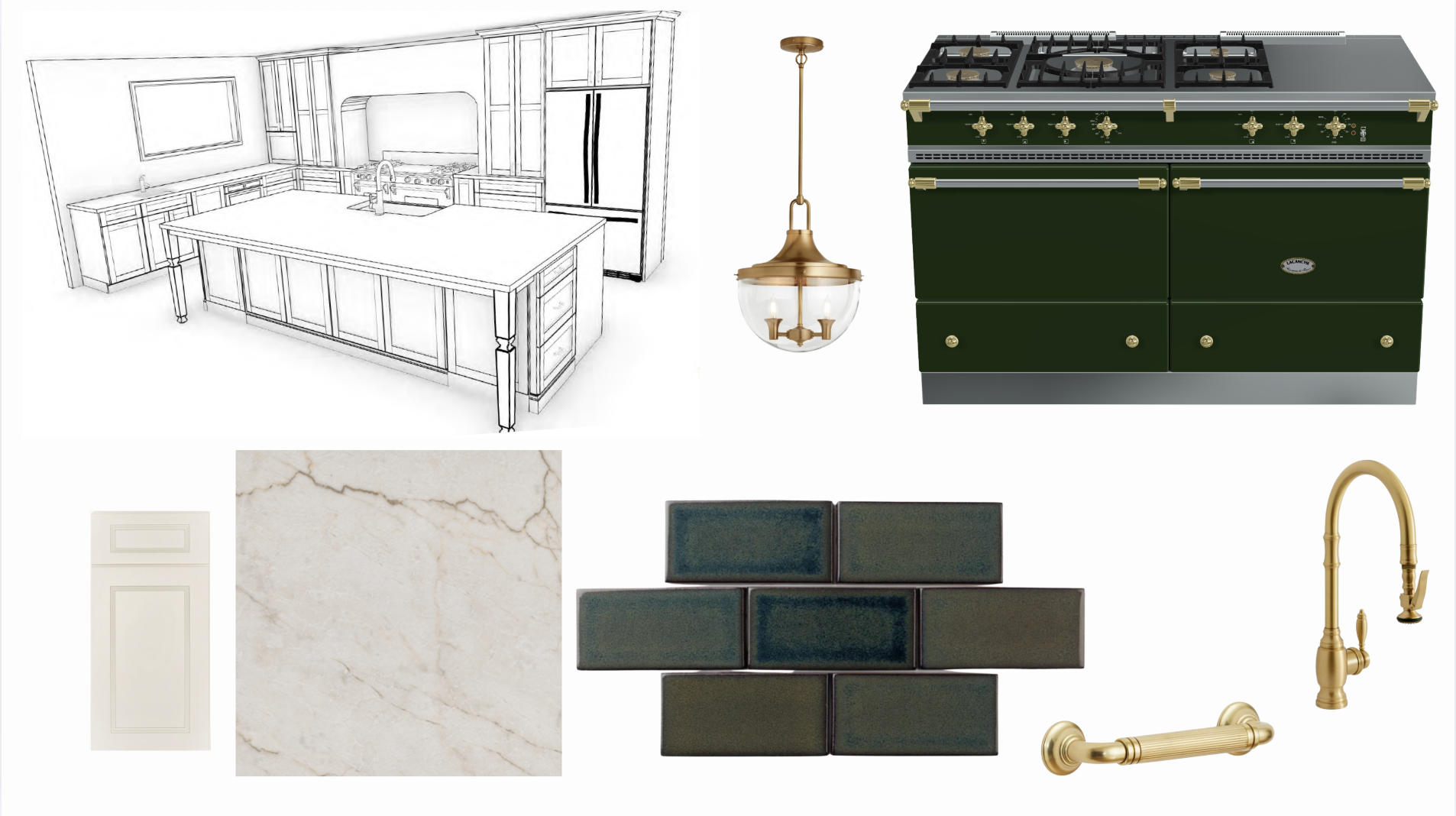 interior shot render this kitchen design as shown floors will be dark walnut wood refrigerator is stainless insert the range pictured in the niche countertops are creamy marble as shown add three brass lights over the island add brass pulls as pictured to all cabinet drawers and doors backsplash behind range wall is covered in greed subway tile pictured it is 3 by 6 inches range niche is plastered in same color as cabinet doors ivory cabinet doors as pictured