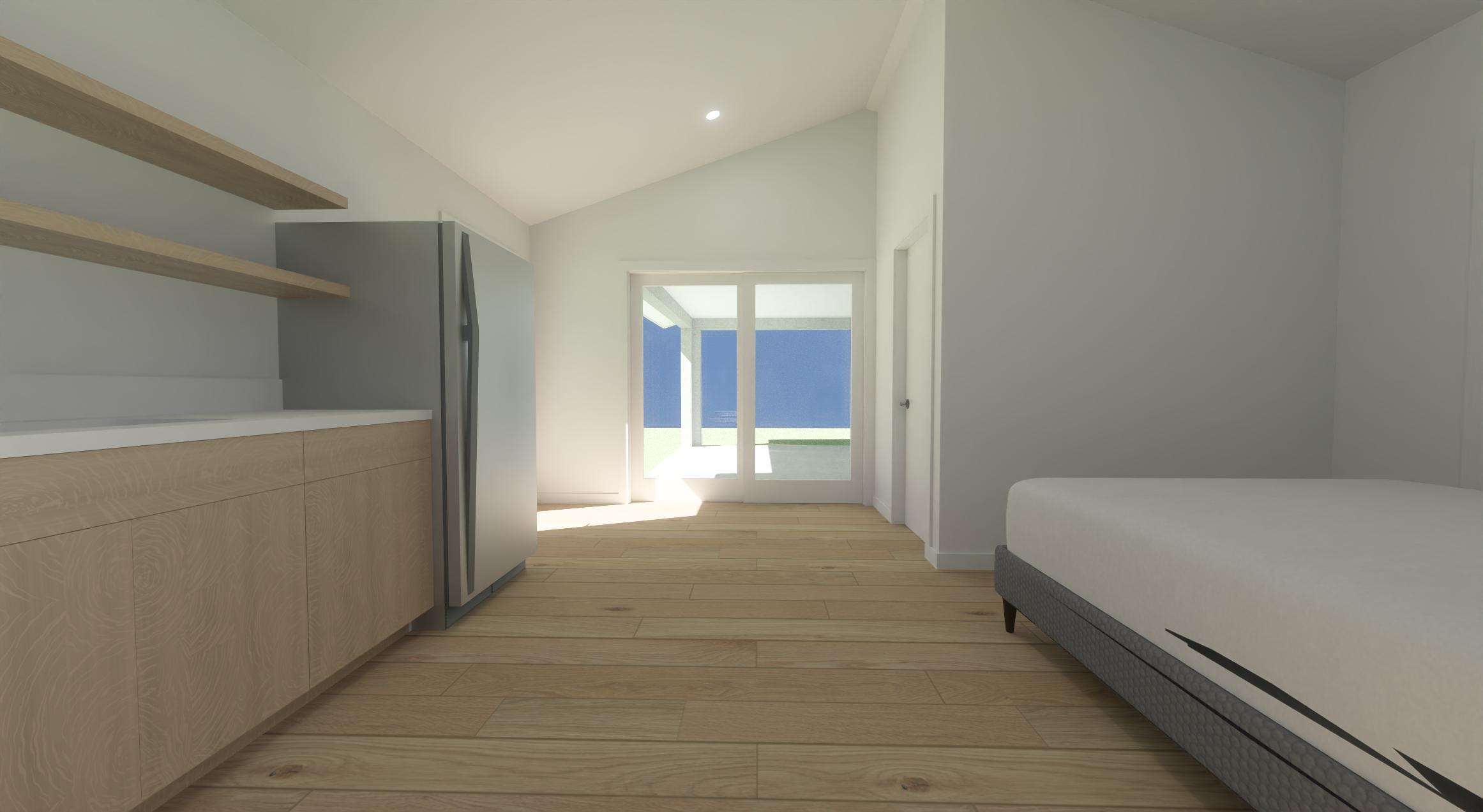 add realism and natural lighting stage the kitchen cabinets and show covers on the bed to the right of the image