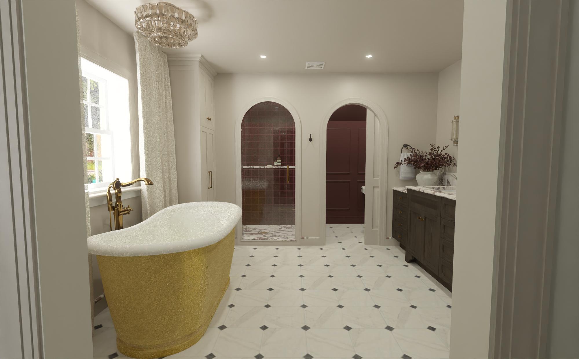 make the outside of the tub polished gold keep the inside white make the curtains light sheer and extend them between the two cabinets on either side of the window behind the tub filler walls to be matte