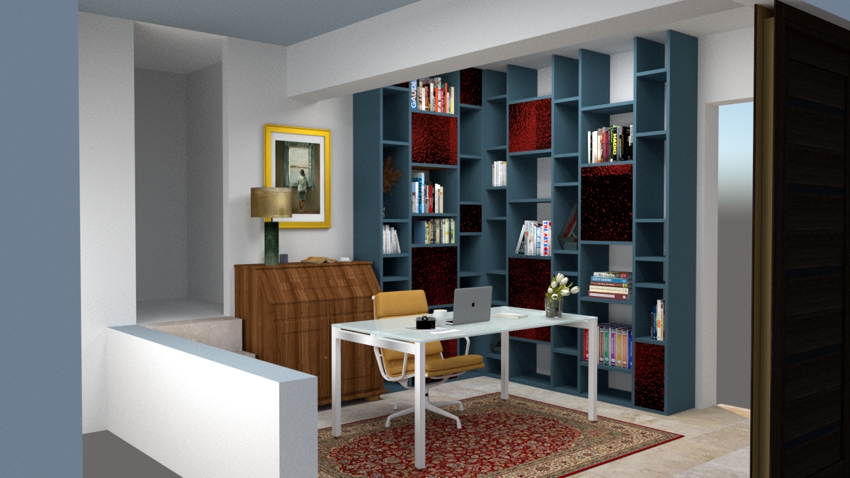 make the image more realistic the red cupboards are fluted dark red glass with lighting from the inside