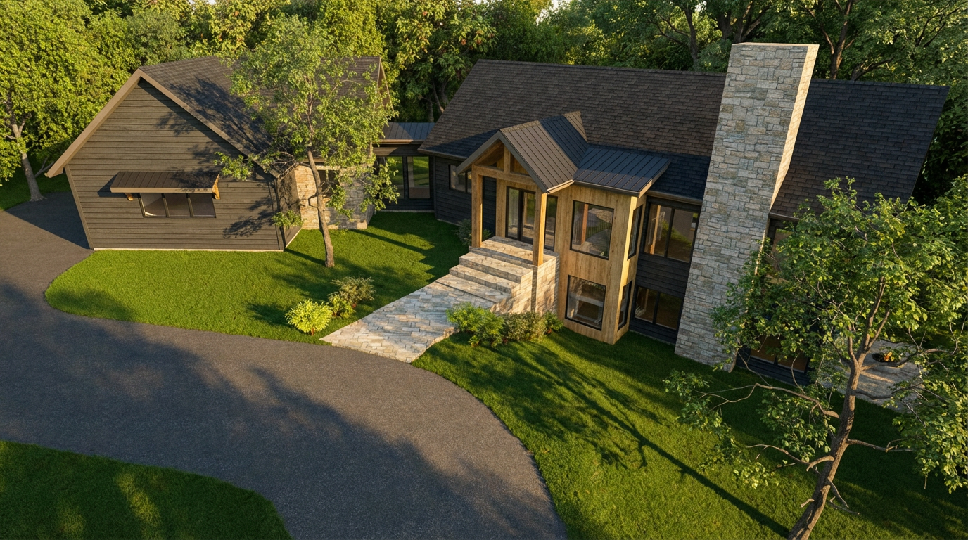 photorealistic exterior architectural rendering inspired by a french country home two story custom residence with steep gabled rooflines strong symmetry and refined detailing exterior materials include warm gray brick and stone siding vertical board and batten accents and light natural brick veneer with subtle texture dark bronze charcoal metal accents on window frames porch roof and garage doors large black framed windows with warm interior lighting visible creating a welcoming glow wood toned garage doors and timber style porch beams add warmth and contrast roof finished in dark charcoal asphalt shingles color palette is neutral and earthy soft greige siding warm dark trim and natural wood highlights clean upscale suburban setting with manicured landscaping and modern plantings wooded background lighting set at late morning hour with warm exterior sconces and landscape lighting for depth and realism ultra realistic materials accurate shadows crisp edges high dynamic range professional architectural photography look 4k quality