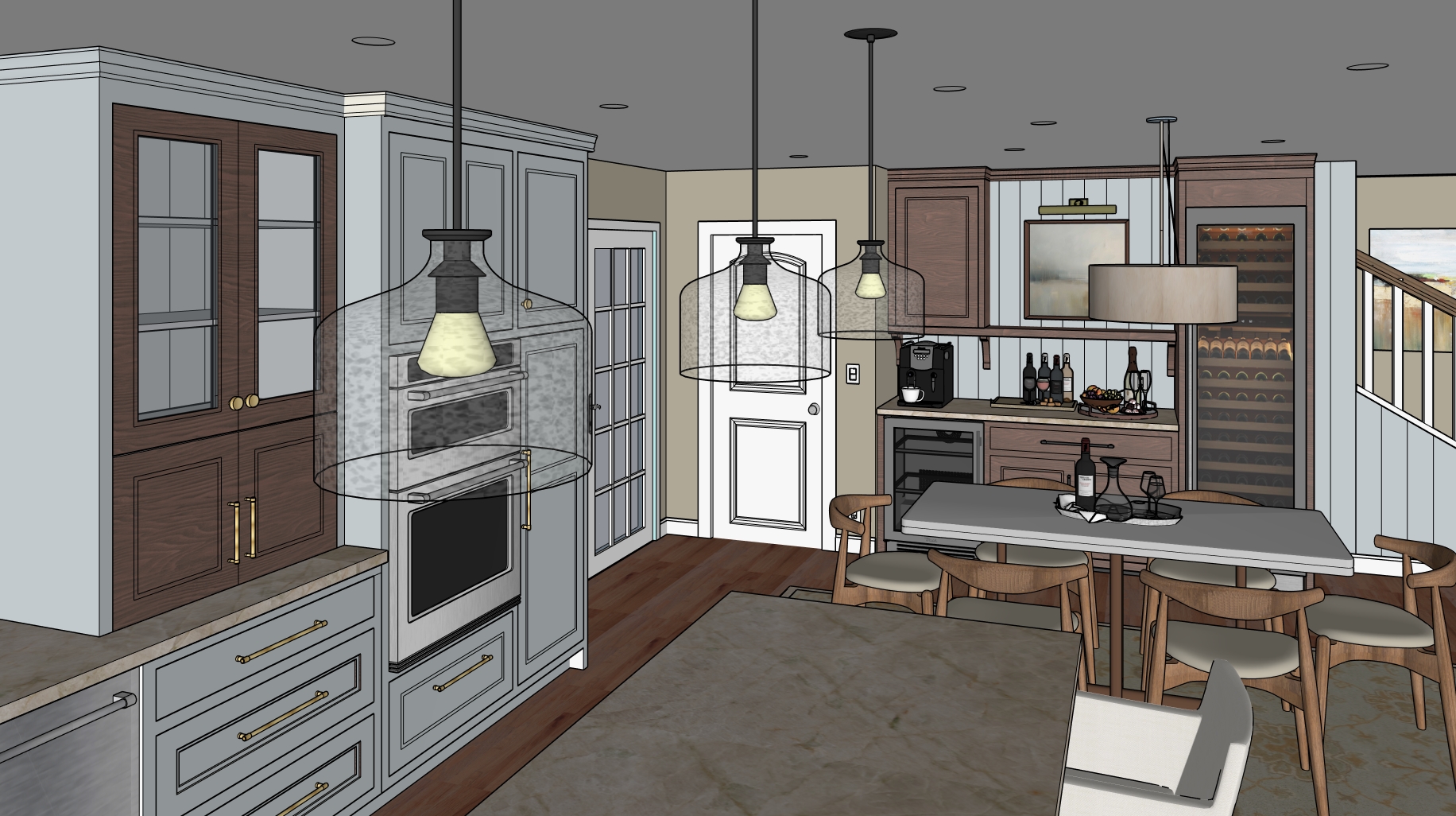 classical interior shot change cabinets on the left side to touch the ceiling and add warm glowing natural light coming through the patio door architecture