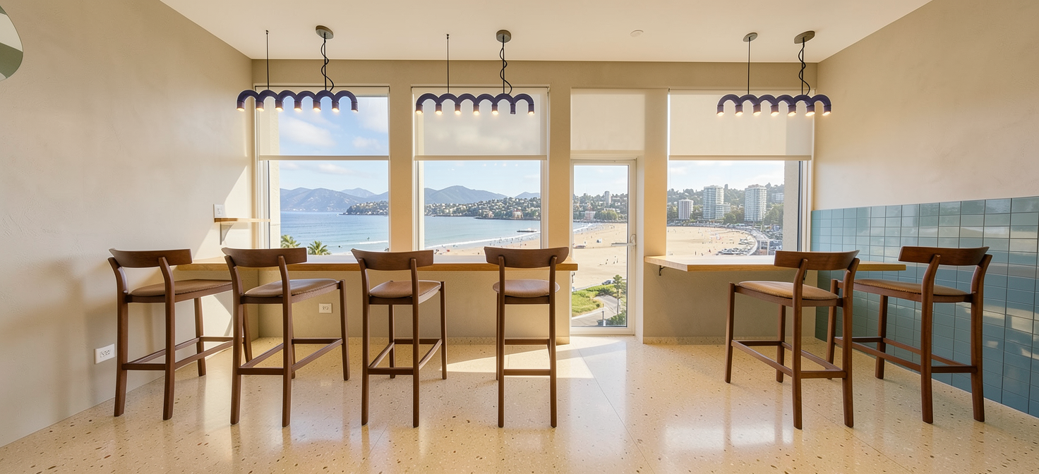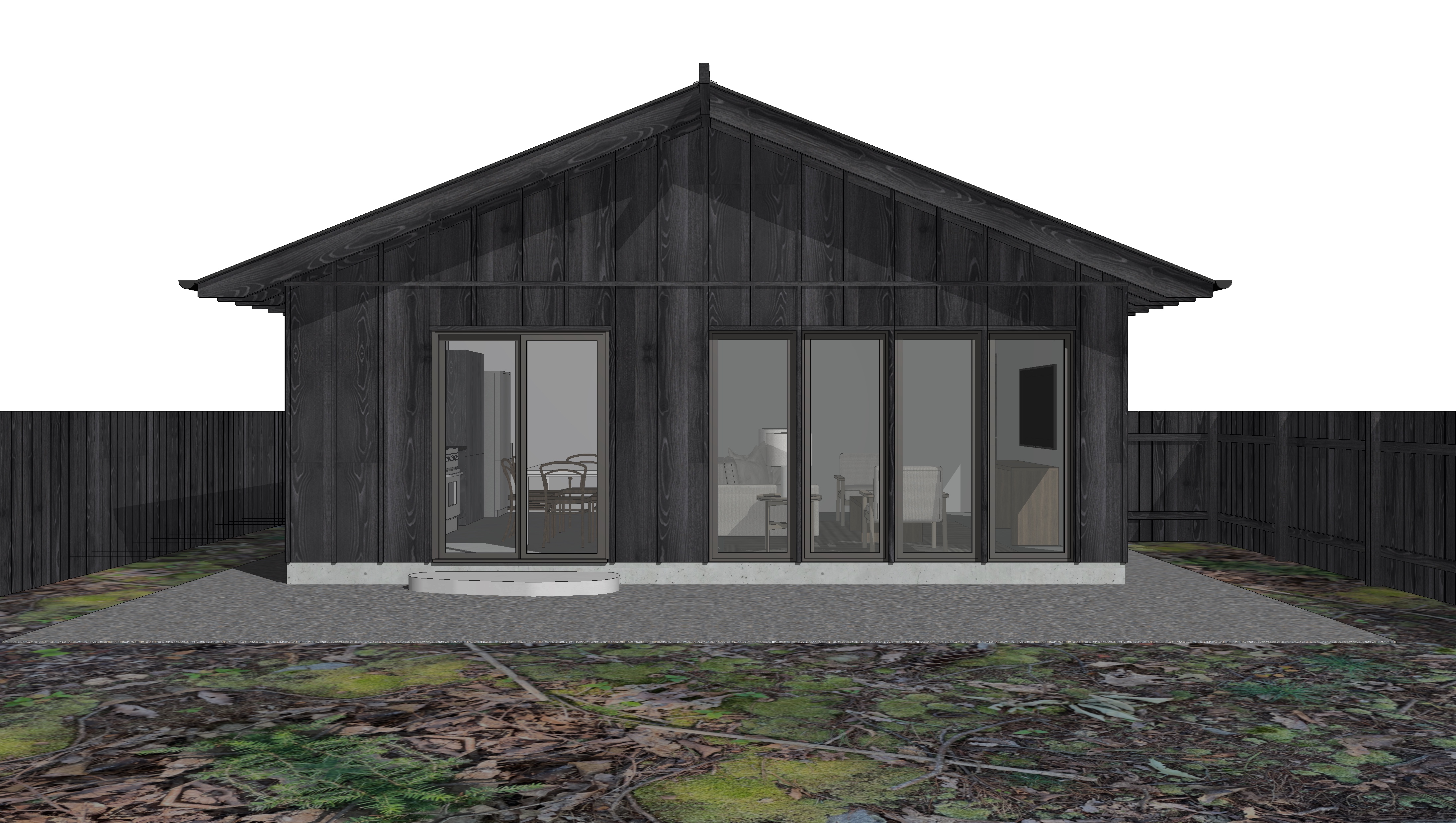 render an enchanting modern cabin with a serene atmosphere the cabin s exterior features rich charcoal wood siding giving it a sleek and contemporary appearance the large glass doors reflect a gentle soft light creating a welcoming glow surround the cabin with a garden path of lush green moss and scattered fall leaves in shades of deep brown and golden yellow adding natural contrast the stone patio is a light gray gravel complementing the cabin s sleek minimalist lines the sky is a soft morning blue casting a gentle tranquil light over the scene a firepit and modern adirondak chairs provide entourage mature trees as a backdrop