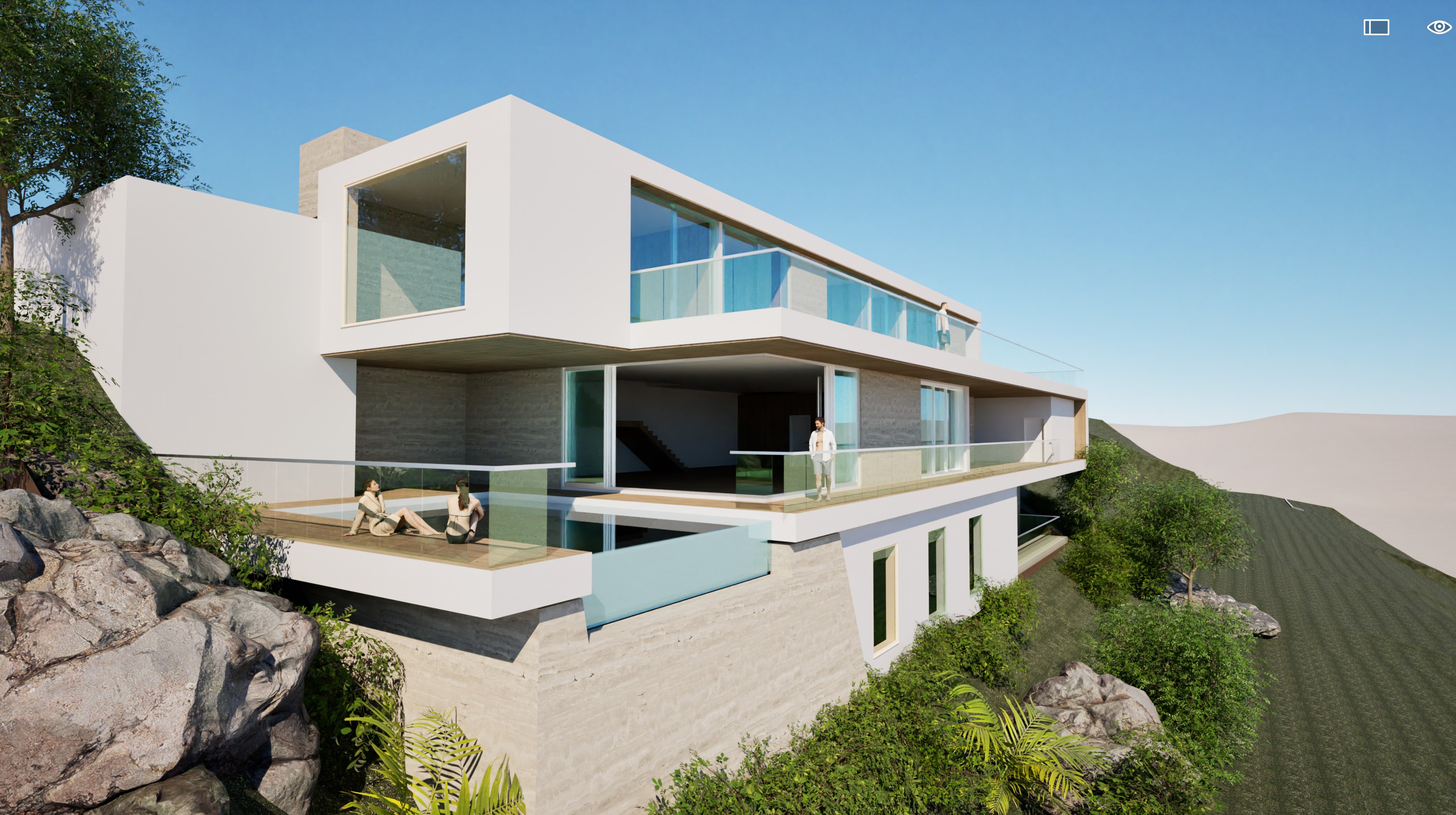 a modern house in pacific palisades ca with smooth white plaster finish brushed aluminum sliding glass door frames and smooth travertine stone accents with frameless glass railings add luxury living room furnitures inside the house view on a hill with grass and olive bushes surrounding the building overlooking the pacific ocean high noon california summer weather