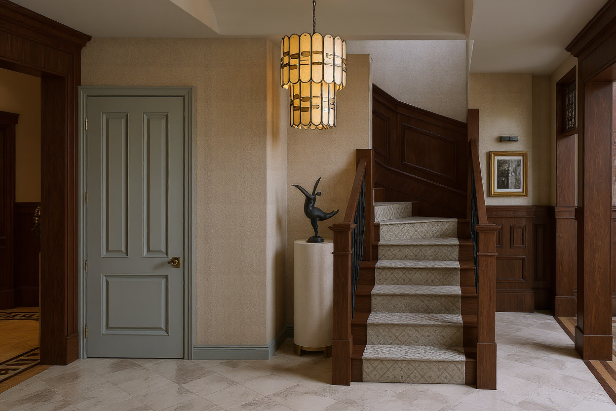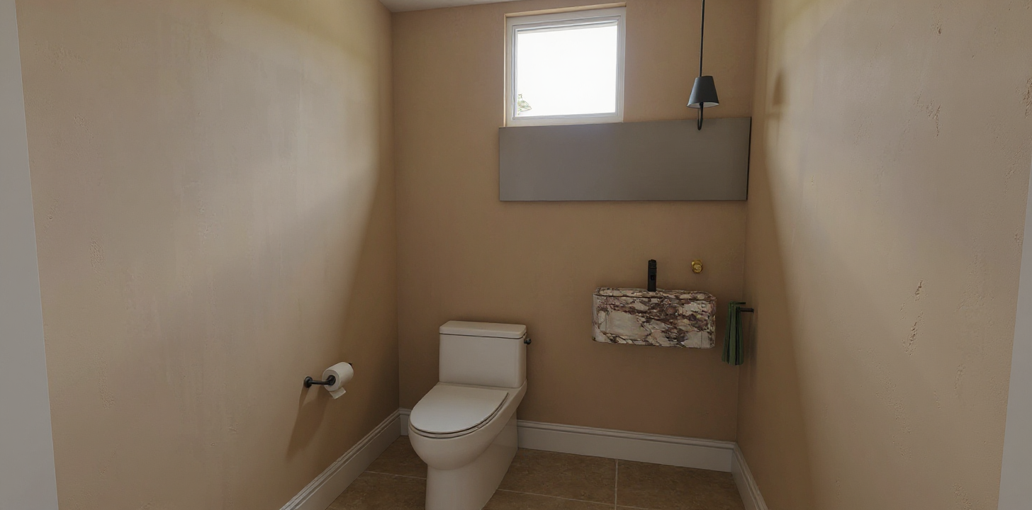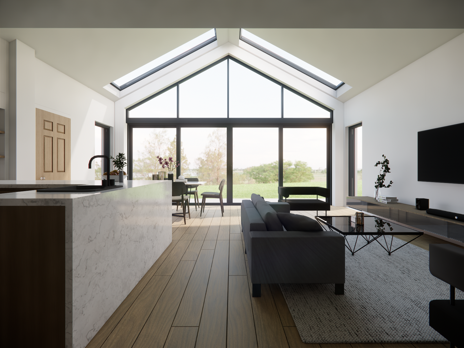 realistic render of an interior from the screenshot this is a rear extension of a uk home keep the same layout and materials make the lighting bright and natural like daytime add white ceiling pinlights for a soft cozy glow keep the lighting realistic and balanced