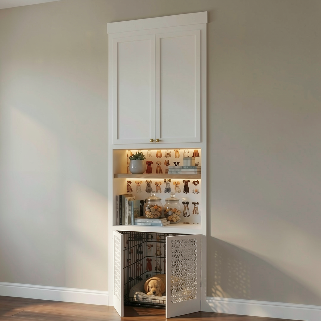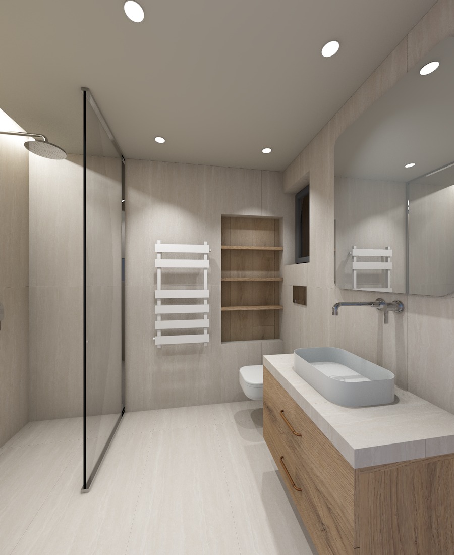 a sleek minimal room featuring the same tiles as previously installed a soft led light glows from behind the round mirror creating subtle ambient illumination chrome faucets and sanitary fixtures complete the clean contemporary look