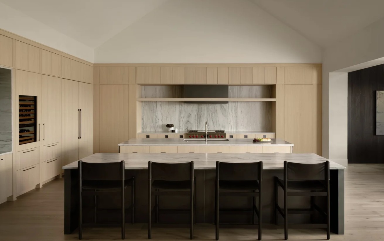 do not change the cabinets in any way preserve the exact cabinet colors materials finishes dimensions door and drawer styles hardware spacing alignment and all geometry exactly as shown do not alter the countertop shape backsplash appliances flooring lighting fixtures or wall structure only remove the construction materials clutter and mess from the scene clean the room and make it look finished and staged add a few simple tasteful home accessories appropriate for the style of the space but do not add or remove any furniture windows or architectural elements maintain the original lighting direction and realism enhance clarity and polish the photo while keeping the cabinetry and room design completely unchanged do not alter the lighting to keep the cabinet colors as they are in the image stage for a luxurious kitchen remove the black island and replace with a modern table