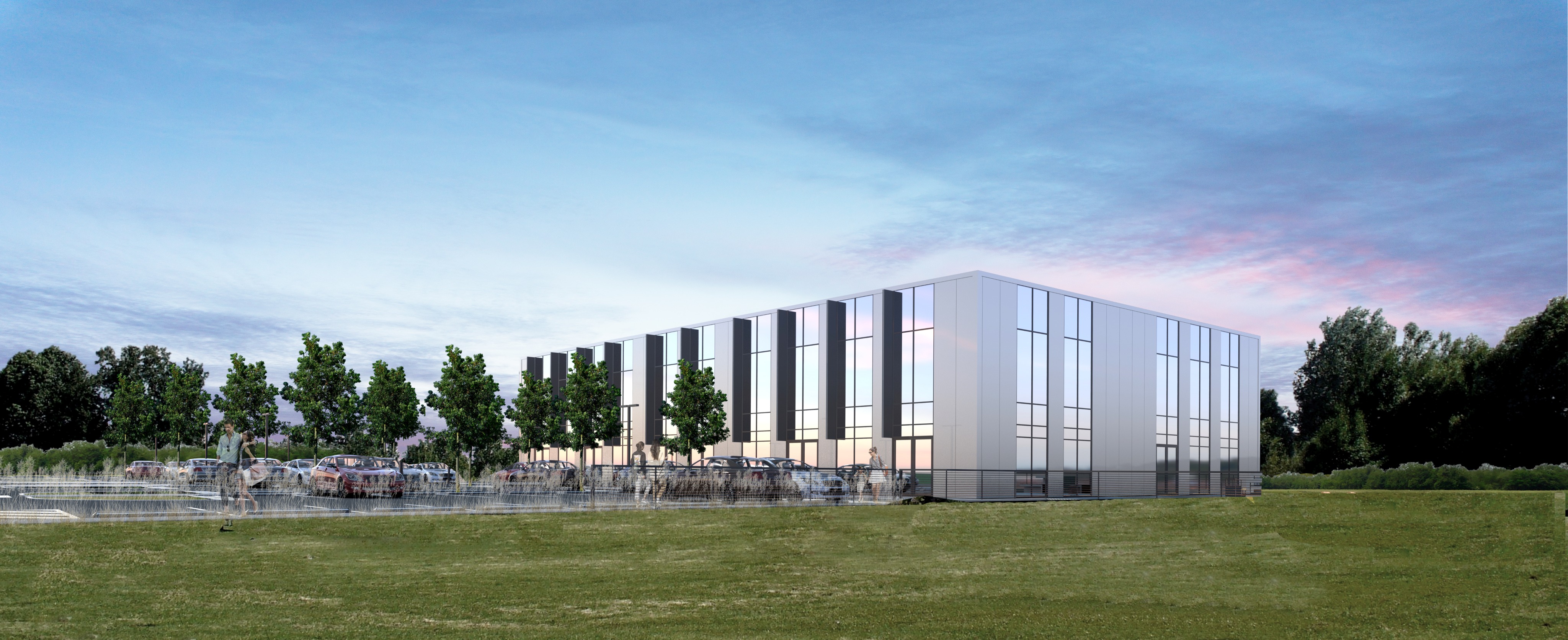 view of a serene landscape with a modern commercial glass building standing out against the lush greenery surrounding it the parking area is a soft light gray lined with rows of vibrant verdant trees the surrounding land is rich with diverse shades of green foliage creating a harmonious contrast with the orderly structure the atmosphere is peaceful and calming with subtle hints of sunlight illuminating the scene highlighting the texture of the earthy browns and deep greens of the natural environment