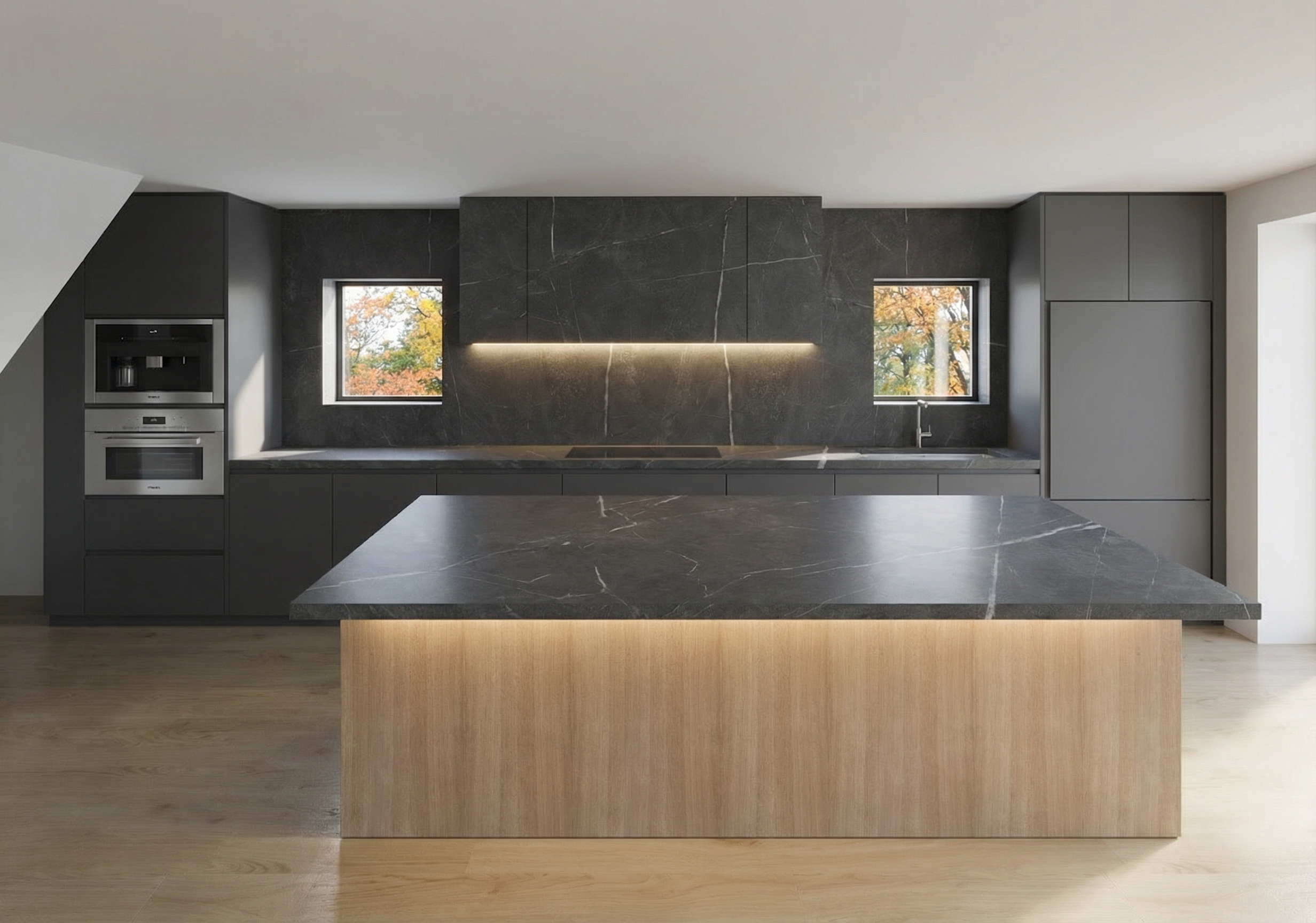 matte countertop and backsplash grey cabinets