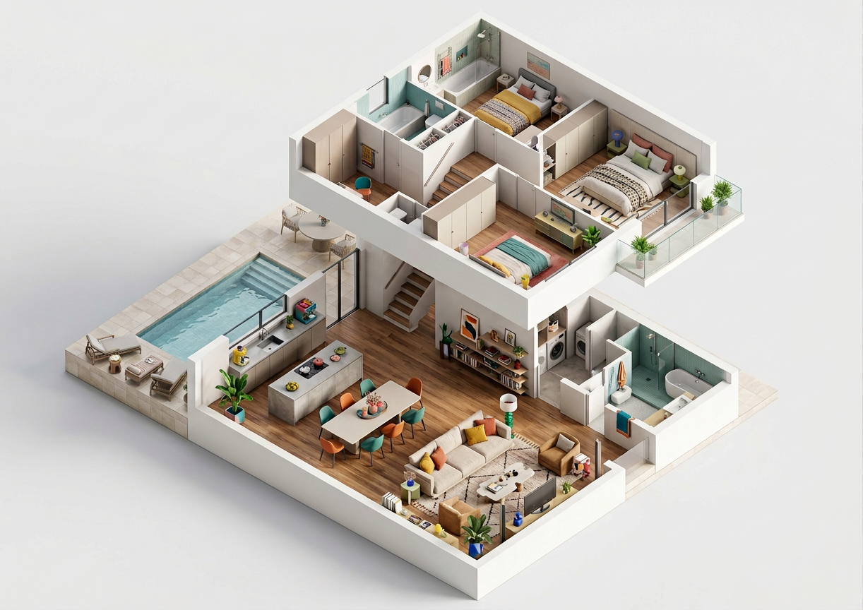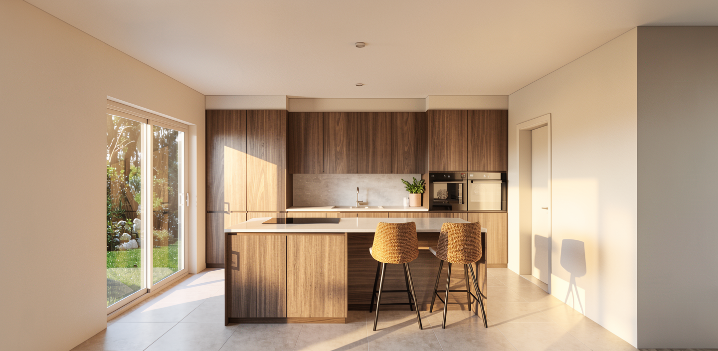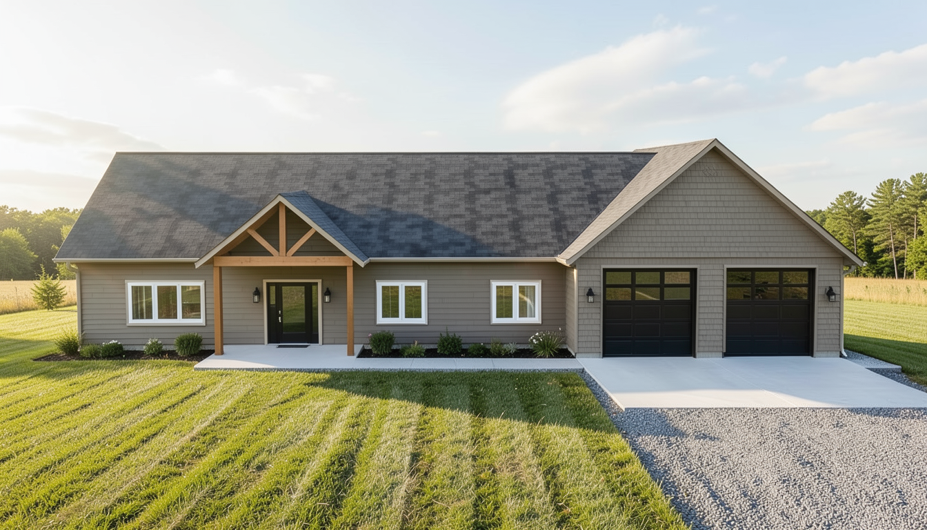 located in a natural field mowed lawn around the house we re looking at the front of the house front of the house faces north so the sun should be shining from the back and shading the front slightly make it look realistic maintain architectural details james hardie lap siding black garage doors white window frames no window grids gravel drive in front of a brushed concrete driveway apron front entry patio and front walkway window trim matches body color of home make sure garage door glass is maintained make white windows appear fairly muted not popping out make doug fir timber framing stain color medium dark