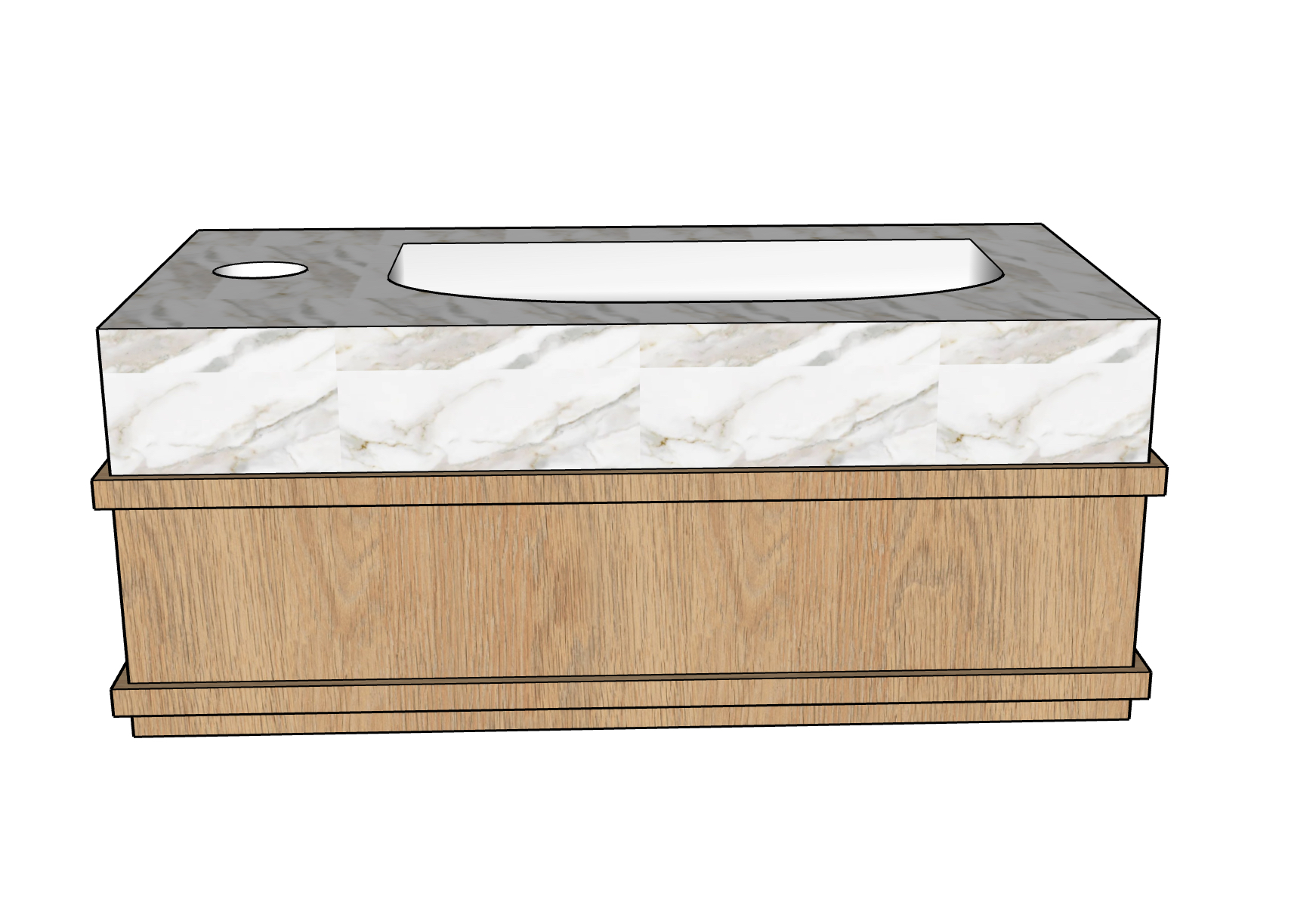 a small marble sink sits on a walnut wood base the marble is light carrara the render has an empty white background