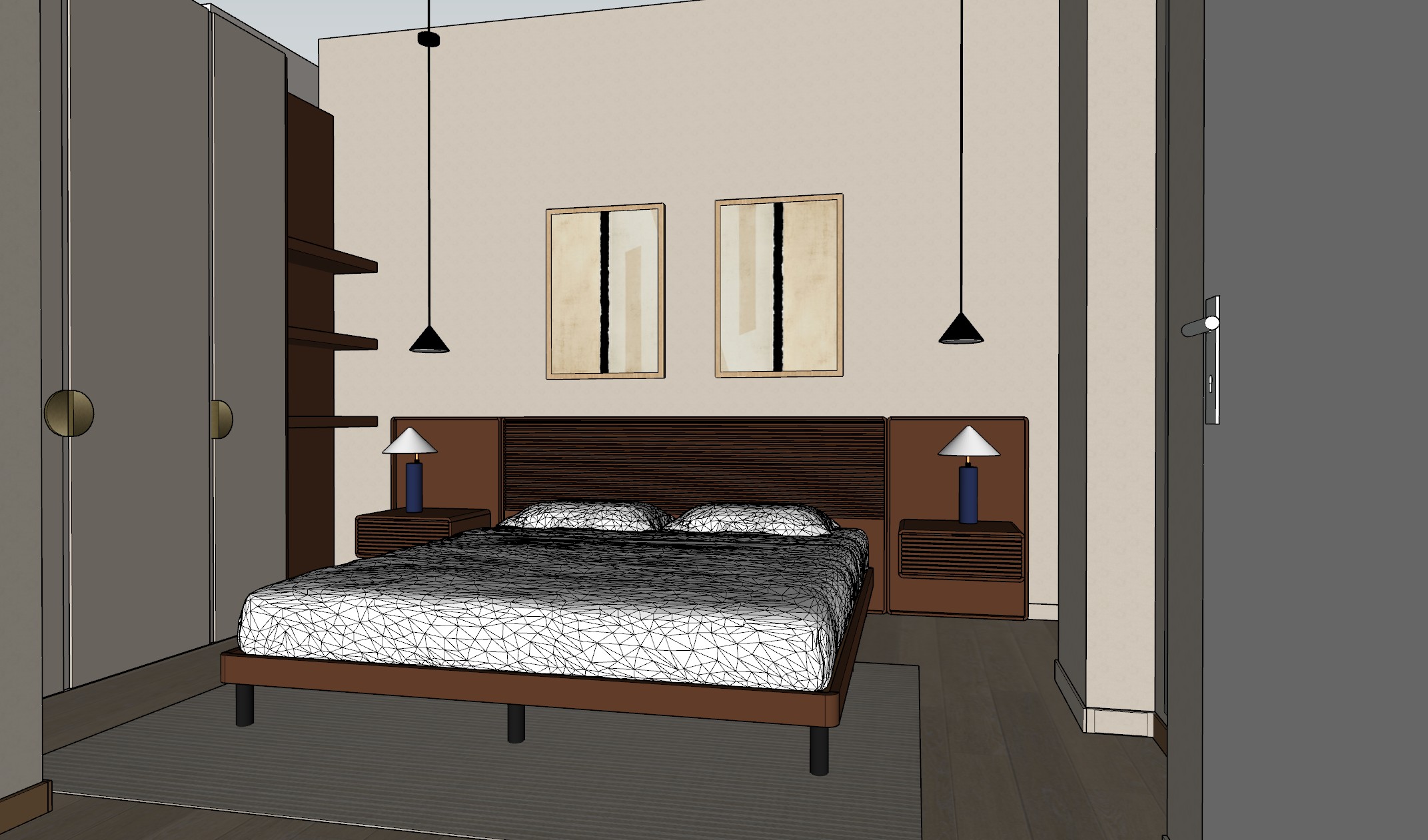 realizza una vista di una camera accogliente e elegante il letto in legno noce canaletto con led integrati il pavimento in rovere naturale chiaro l armadio le ante laccate avorio e la nicchia in essenza noce con led interno