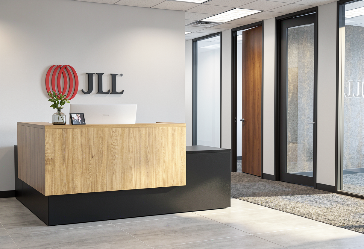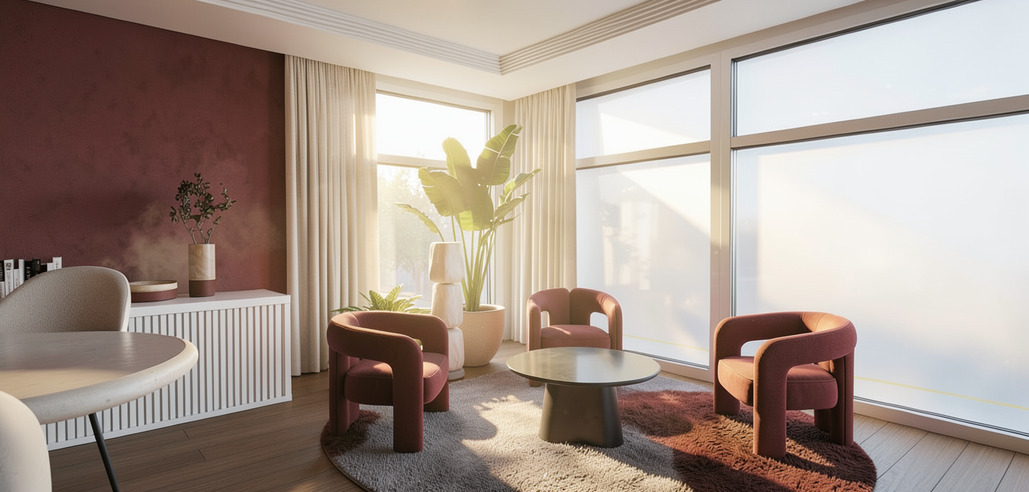 create a photorealistic interior rendering based on the provided reference image do not change the layout do not move walls door opening cabinets or shelves cabinet layout this is a corner cabinet installation on the right side of the corner is an 18 wide wine cabinet in stainless steal represented by the black to the left of the wine cabinet is a 24 flush mount cabinet in white represented by the blue both cabinets share one continuous white marble countertop above the countertop are two floating shelves surroundings the red wall on the right repersents a white door with white trim and molding all walls are white the left side opening leads to a kitchen and the refrigerator is near that opening do not focus on the kitchen keep the camera focused on the corner cabinetry