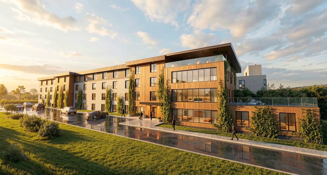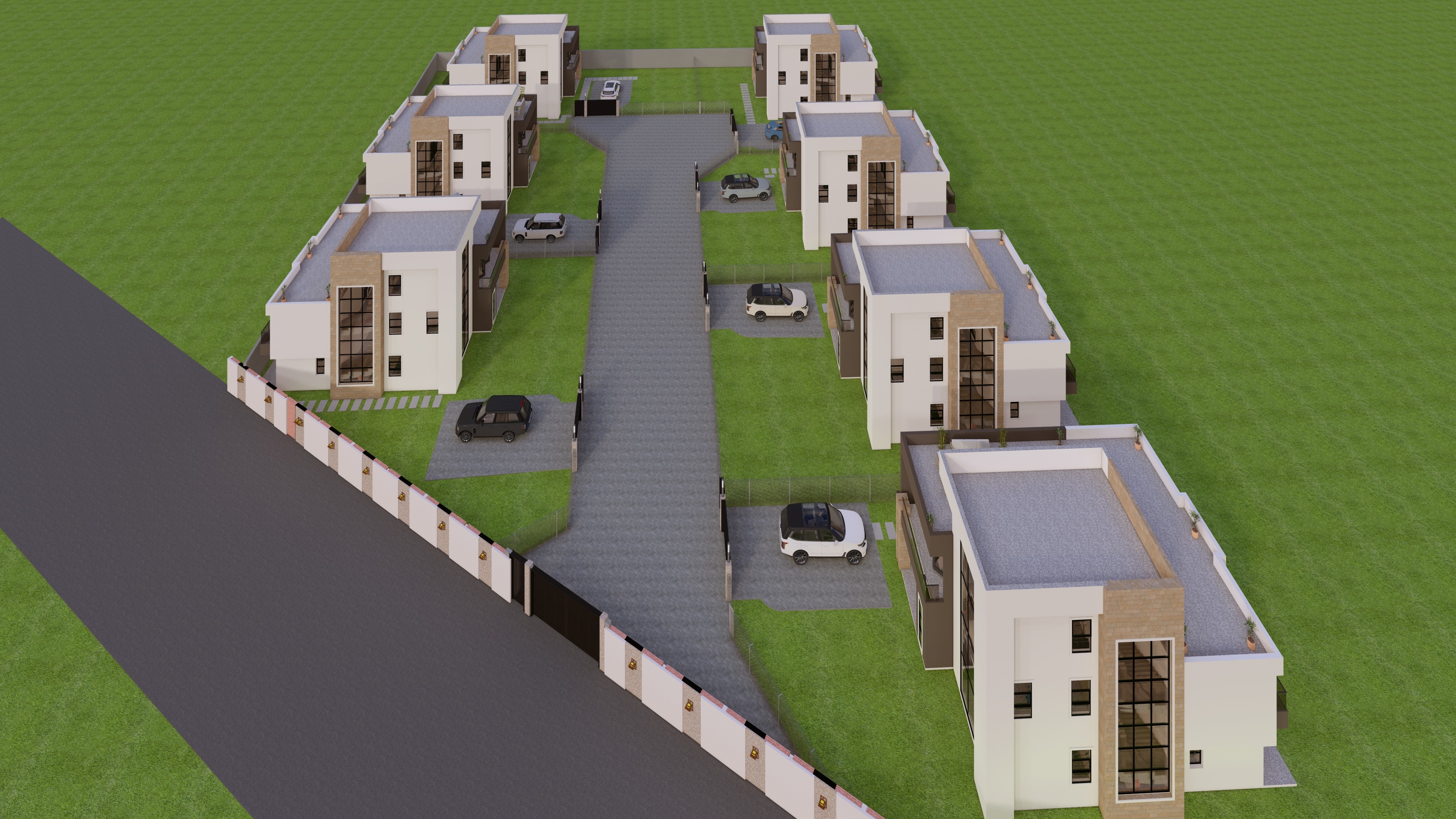 this is a housing estate add very few trees and vegetation in background to give it context have indoor warm lighting there should be some daylight