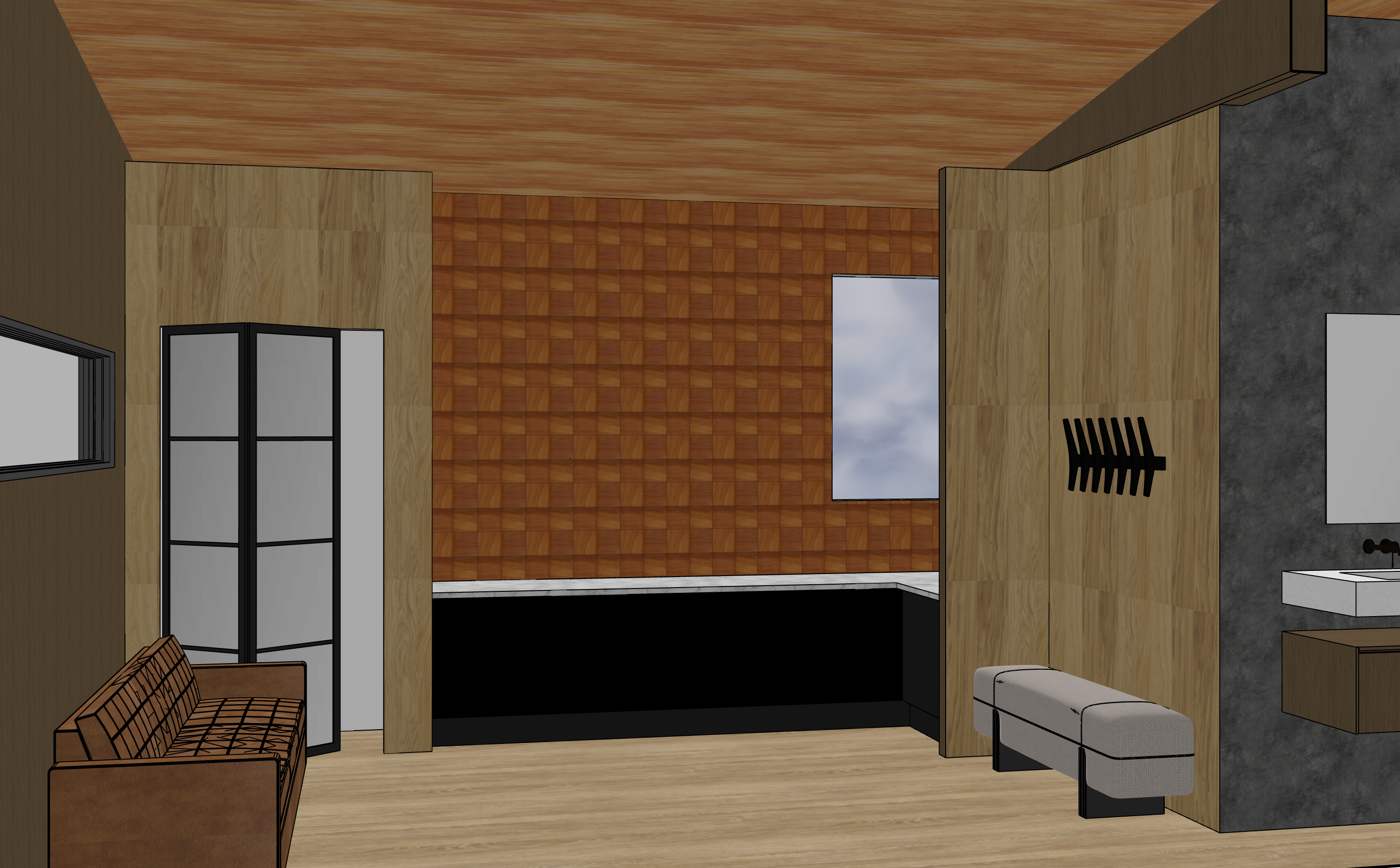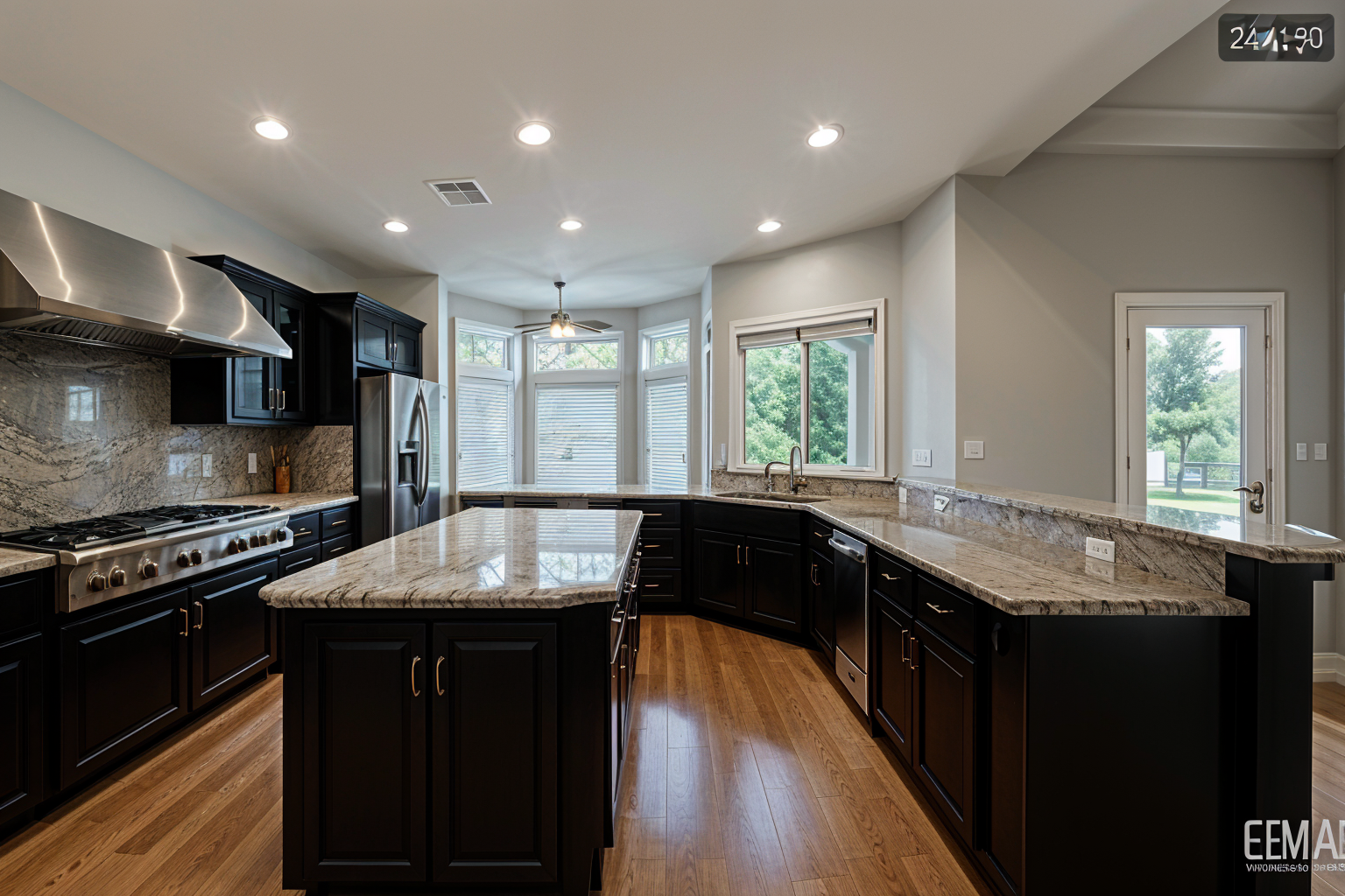 interior shot red oak walls black base cabinets window with mountain view