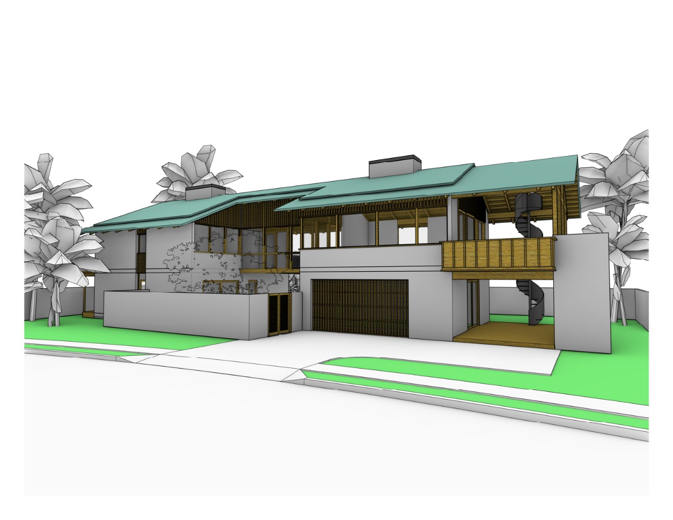 house location is in lahaina maui the standing seam metal roof should be matte color dull light green the house is concrete grey with light colored natural wood framing place an old olive tree in the courtyard
