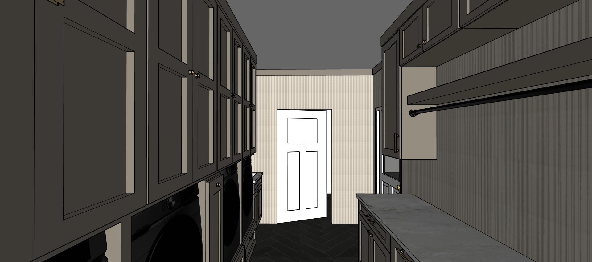 black matte tile flooring medium tan gray cabinets bathroom straight ahead behind the door pin stripe neutral wall paper crown molding all the way around the room that matches cabinet color