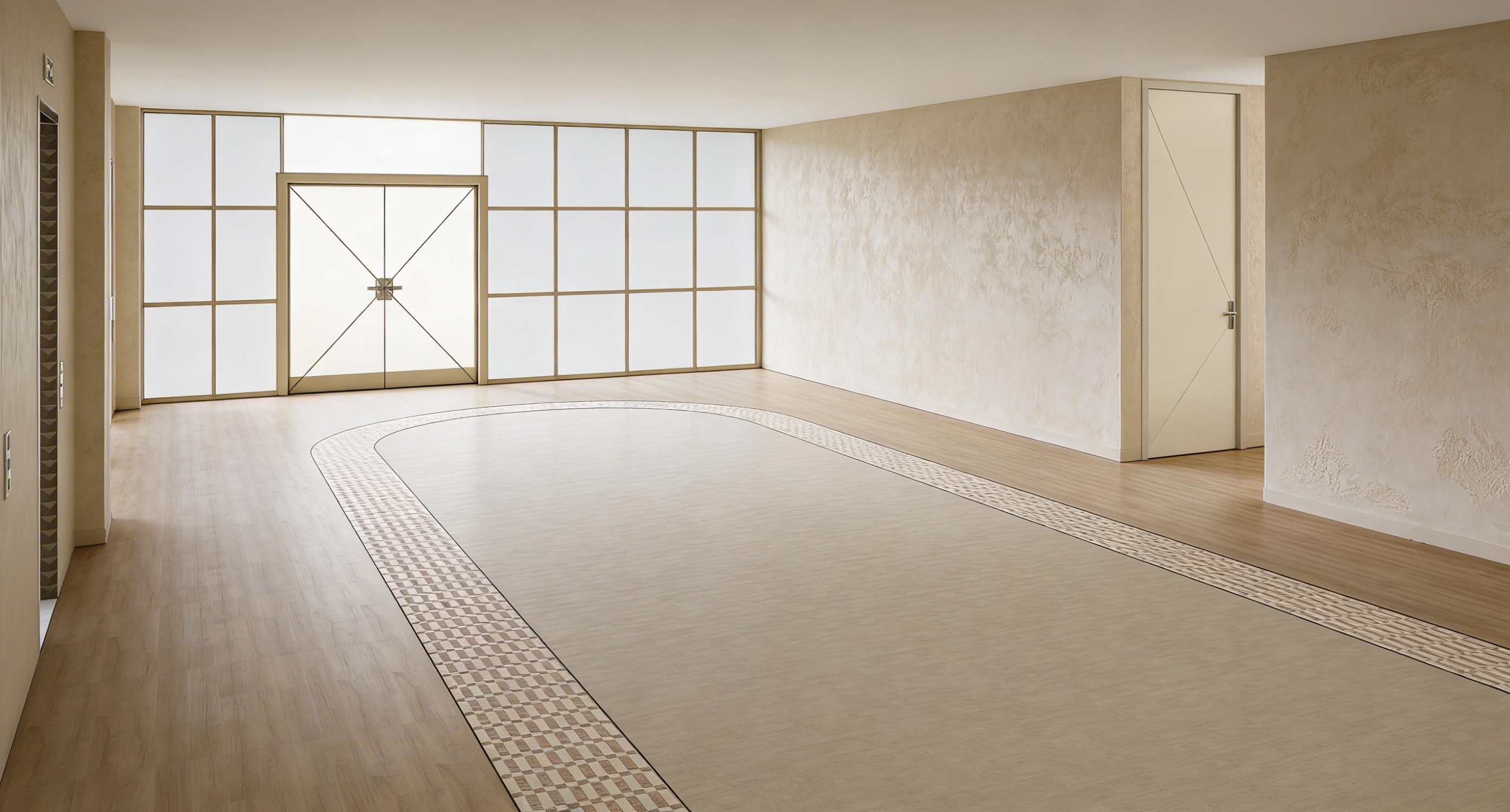 colours to remain accurate as per original given picture wood texture to be subtle 2 doors on full height cabinet in mirror dresser top hung middle in mirror drawers and table surface in muted soft pink subtle wood grains niche in light beige microcement top half of carpentry in light beige 2 casement door below window in light beige ceilng in off white floor in muted light beige vinyl subtle grains 20mm recessed handle below mirror cabinet 50mm recessed skirting on top of mirror cabinet