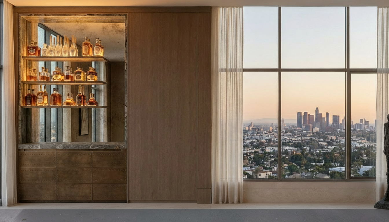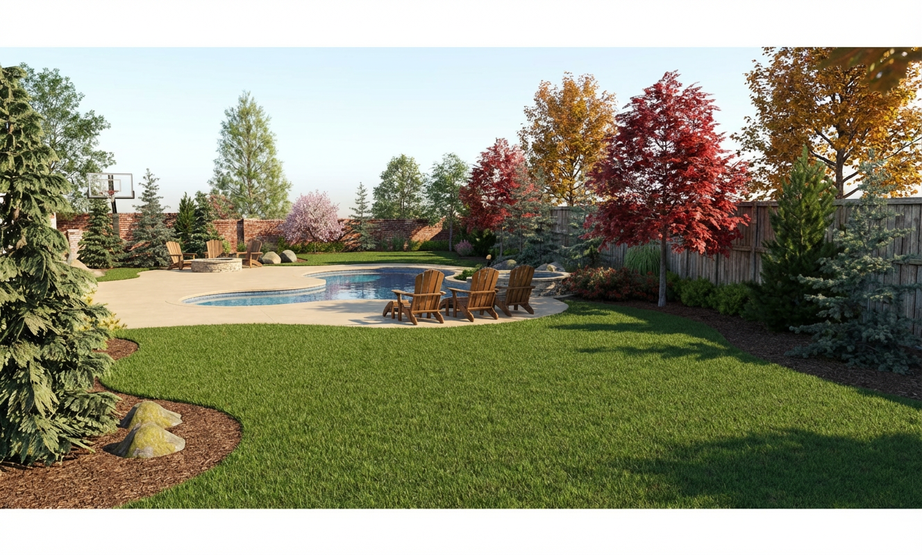 bring life to this rendering with elegant details that fit the feeling of a serene kitchen in the morning with simple elements and arrangements the outside past the windows is a small patio walkway and a large hedge bush with the sky above